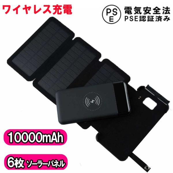 ソーラーモバイルバッテリー 10000mAh ワイヤレス充電器 大容量 LEDライト付き 折りたたみ式 6枚パネル 分離可能 携帯充電器 PSE認証