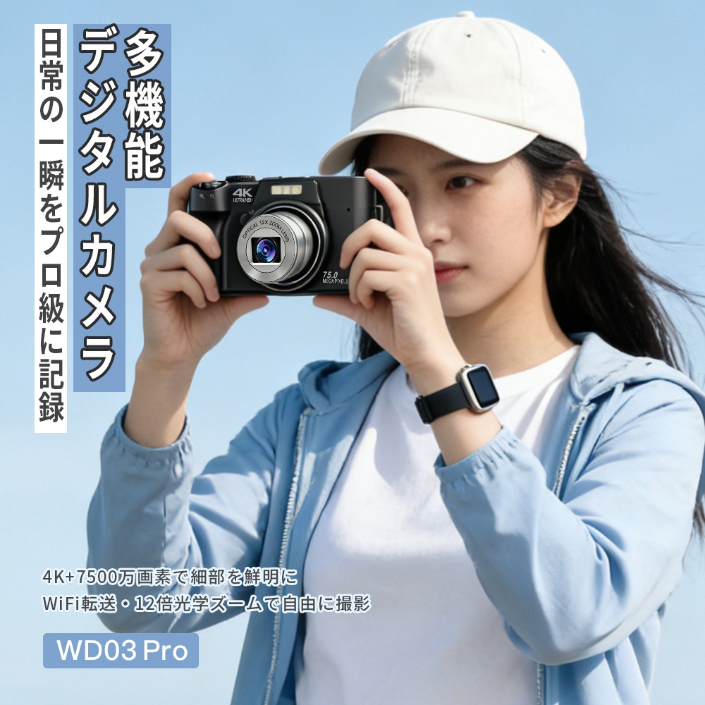 デジカメ WIFI対応 12倍光学ズーム カメラ 4K 7500万画素数 マクロ 64GBSDカード付き 3インチ LEDライト 修学旅行 コンデジ 子供 初心者向け 自撮り