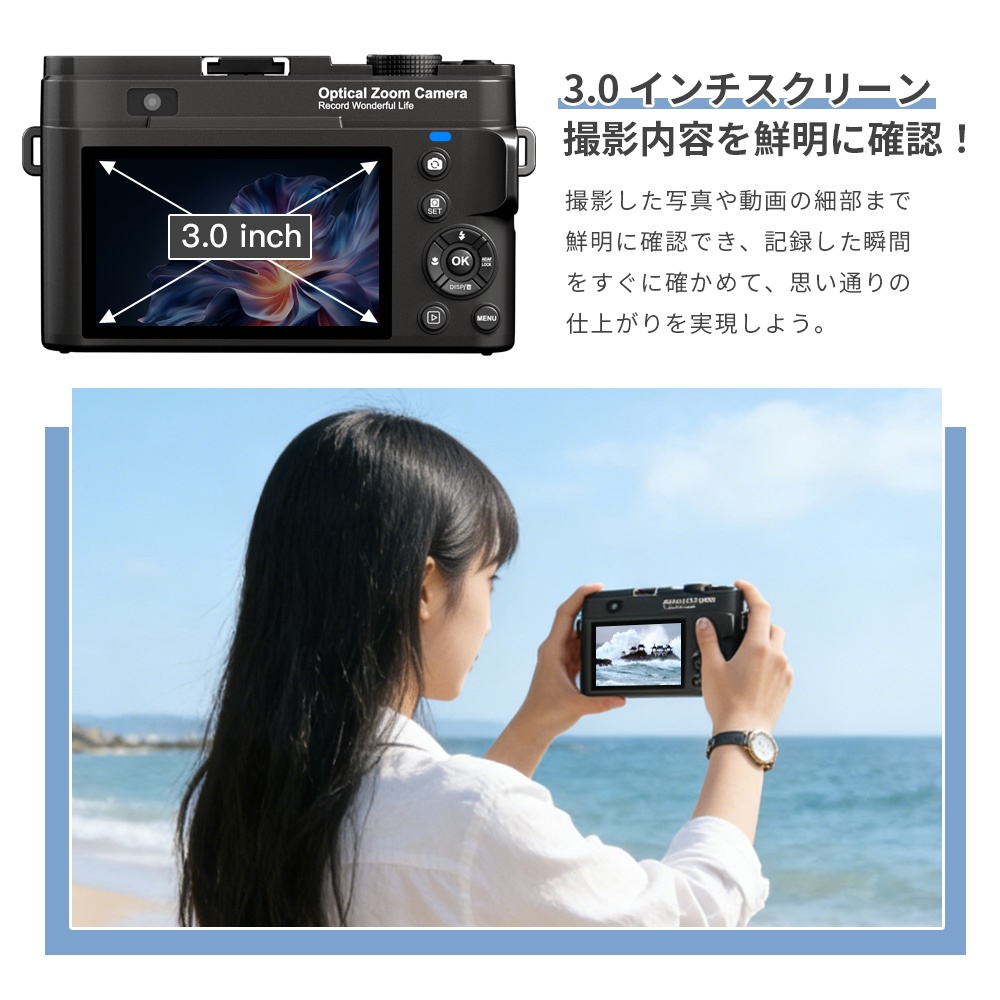 - 基本仕様 ◇サイズ:125.64×72.04×43.52mm ◇モニター:3.0インチIPS ◇ズーム:12x光学ズーム ◇レンズ:外伸縮レンズ 商品説明 【WIFI転送機能でスマホに送れる】今まで少ない本体にWIFI機能を搭載されておるコンパクトデジタルカメラです。デジカメのWi-Fi機能によって外出先でも簡単にスマホと連携できるため、撮影した画像の転送やSNS投稿などの操作がスムーズにこなせます。専用アプリより撮った画像や動画をスマホに転送でき、コードレスでシェアでき、カードリーダーやパソコンなどを利用する必要がありません。撮影画像の取り扱いにおいて、スマホを手軽に活用できるのがWi-Fi対応デジタルカメラのメリットです。 【12倍光学ズーム&4K動画&7500万画素】6倍光学ズーム+2倍デジタルズーム搭載。遠く離れた被写体でも、画質を損なわず撮りたい細部まで拡大して、きれいに撮影できます。細かくて小さい被写体もきめ細やかに写り、リアルに再現します。MAX7500万画素で、自由に撮影でき、多機能で日常を豊かに記録可能です。 【64GBMicroSDカード&内蔵バッテリー&充電口】2000mAh大容量バッテリーのほか、便利なType-C充電口をも搭載しているため、日常の使用で長時間の撮影が可能です。運動会、発表会、セミナー、コンサートで遠くの被写体を撮影する時など、長時間の撮影に最適です。また、本製品には64GBMicroSDカードも付属しておりますので、到着次第にすぐに使えます。本製品は最大256GBのMicro SDカードに対応していますことをご注意ください。 【セット内容】1×デジタルカメラ、1×64GBMicroSDカード、1×USBケーブル、1×日本語取扱説明書、1×収納袋、1×ストラップ。本体重量はわずか223g(内蔵電池含む)と非常に軽量で、女性や学生でも長時間使用できる、コストパフォーマンスの高いデジタルカメラです。家族写真、運動会、忘年会、卒業式、旅行、イベントなど、さまざまな場面でお使いいただけます。 備考 ●大量注文承ります! 製造メーカーの直営店ですので、大量のご注文にも対応可能でございます。 どうぞお気軽にご相談ください。 ご注意 ※商品画像は、素材や照明の具合や、お客様ご使用のパソコン、モニター等の環境により、実際とは色合いが異なる場合がございますが、予めご了承下さい。 関連キーワード カメラ レトロ デジタルカメラ 光学ズーム 伸縮レンズ 12倍光学 ズームコンパクト デジタル カメラ 4K 8K解像度 5K解像度 デジカメ WIFI機能 16Xデジタルズーム 18Xズーム VLOGカメラ YouTubeカメラ Webカメラ コンパクトデジタルカメラ Vloggingカメラ ウェブカメラ フォーカスデジタルカメラ モードダイヤル 5Kデジタルカメラ キッズカメラ オートフォーカス 充電式 自撮り8800万画素 3.0インチ画面 日本製センサー搭載 手振れ補正 64GBマイクロSDカード付き 光学ファインダー 連写 軽量 オシャレ おしゃれ ブラック ホワイト ピンク クリスマス プレゼント ギフト 旅行 イベント 修学旅行 卒業式 入学式 入学祝い 入園祝い 学生 初心者向け 父の日 母の日 メーカー希望小売価格はメーカーサイトに基づいて掲載しています メーカー希望小売価格はメーカーサイトに基づいて掲載しています