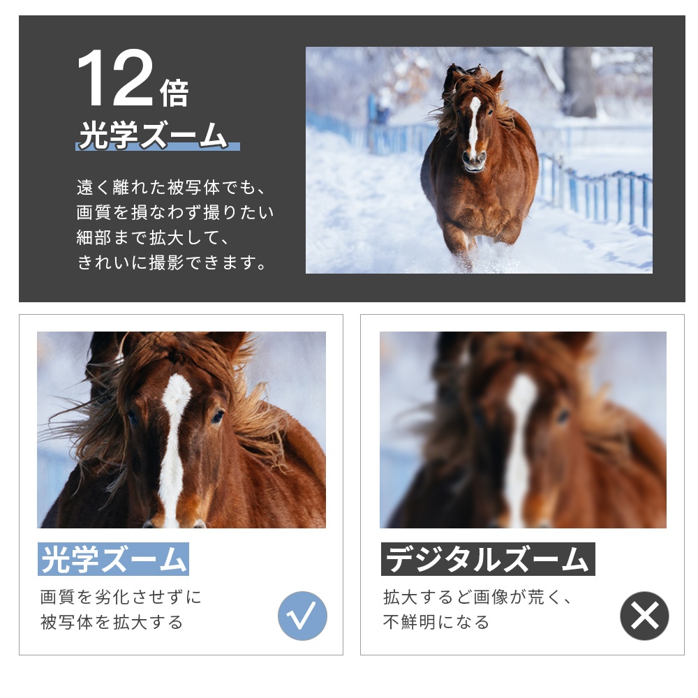 6 倍光学+2 倍デジタルズーム 12×光学ズーム