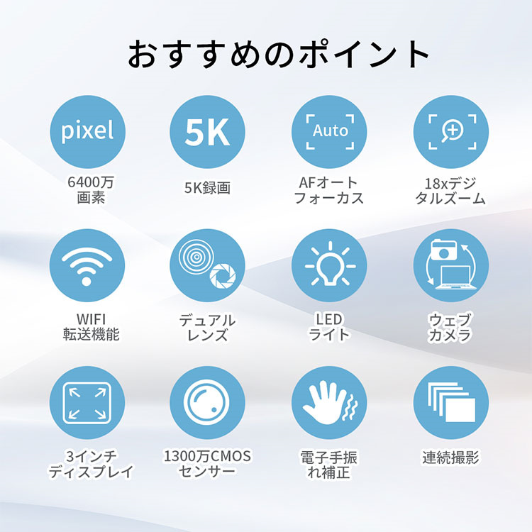 デジタルカメラ デジカメ 日本製チップ 5K WiFi機能 64GBマイクロSDカード付き 18倍ズーム 6400万画素 高画質 オートフォーカス ウェブカメラ ビデオカメラ