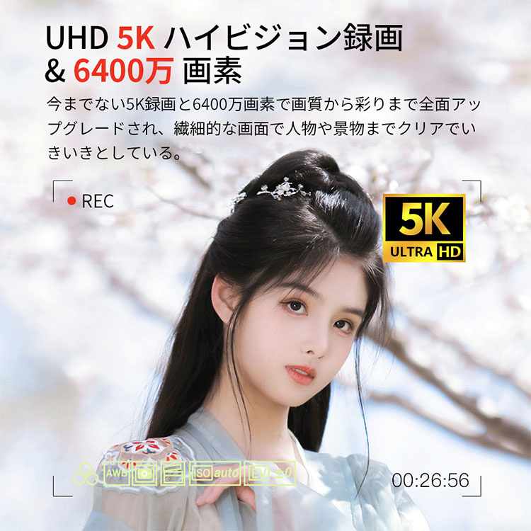 【5K録画&6400万画素&18倍デジタルズーム】最大5Kの圧倒的解像度で動画撮影!優れた5Kビデオ解像度と6400万画素の画質で、花びらの質感や、おしべの細かいディテールなど細かい部分まで詳細に写っており、非常にシャープで抜けのいい描写です。細かくて小さい被写体もきめ細やかに写り、リアルに再現します。また、市販の16倍デジタルズームに比べて、本機器は18倍デジタルズームを搭載されており、レンズを動かすことなくかなり遠くまでしっかり撮影することができます。<br>