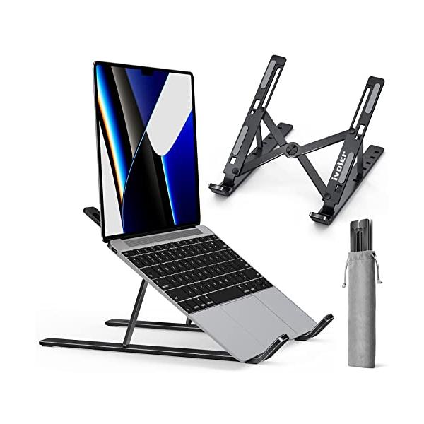 - 【2022最新特別なデザイン・折りたたみ式発売】従来のプラスチック、重い合金から改良して、回転軸の部分は全部金属材料を採用しながら特別な中空デザインで 放熱面積が最大限度に広げて 耐久性も優れて長時間でも使用可能です。また、表はアルミニウムで、触れると金属素材ならではの冷たさを感じられて、手触りはスムーズで高級感があります。さらに、わずか245gの超軽型かつ折りたたみ式なので、ノートパソコンを外出先で使うことにも便利です。【人間工学設計&6段階角度高さ調節】ノートパソコンスタントは人間工学に基づいた設計により、高さを5~15.5cmまで調節できて、台座の傾斜角度も0~40°まで変えられますので、背筋が伸びて、自分に適した姿勢でノートパソコンに向き合いやすいです。使用者の身長に合わせて高さを調節できるので、正しい姿勢でパソコン作業できます。【持ち運びに便利&滑り止め】ノートパソコンスタンドは折り畳みやすく、スペースを節約し、携帯に便利です。収納バッグも付いていますので持ち運びに便利です。薄くて軽量なので、保管場所を選ばず、出張などにもバッグに入れて持ち運びできます。在宅でも出勤勤務でも、おススメできるアイテムです。パソコンが当たる部分にはシリコンゴム製の滑り止めが施されているので落下の心配なく使用が可能。スタンド接地側も滑り止めが付いているので、デスクに置くと滑りにくく安定して使えます。注意:スタンドが斜めになる台面と水とかある台面に置かないでください。【幅広い対応機種】Macbook/Macbook Air/ Macbook Proシリーズ/Surface/Surface Proシリーズ/Surface Book/iPad Pro/Sony/HPなどのすべての7−17.3インチまで対応しているため、ほとんどのデバイスのlaptopに適応します。また本や雑誌、スマホなど、様々なデバイスに幅広く使用できます。【優れた放熱性・高級感アルミ合金素材】冷却しやすい高品質のアルミ合金素材を採用されるため、中空デザインでによって、排熱効果が抜群で、ノートパソコン冷却台としてもご使用いただけます。空気の流動性と放熱性を向上させているので、パソコンなどのデバイスの使用寿命を延ばし、ノートパソコンはより速く運行することができます。PCスタンド全体的な構造からディテールに至るまで 精巧に作られ、放熱面積が最大限度に広げて、耐久性も優れていて長時間使用可能です。