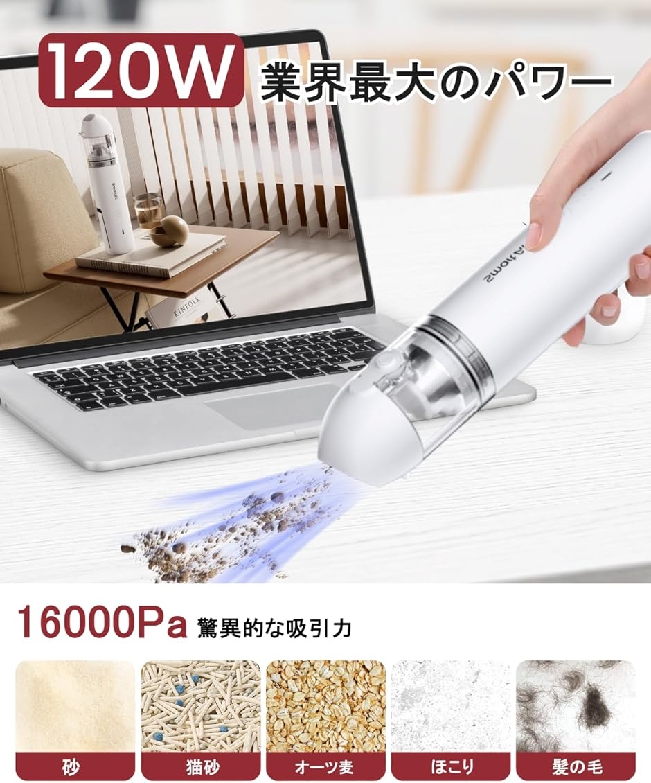 ハンディクリーナー 車用掃除機 16000Pa 強力吸引 40分連続稼働 折りたたみ式ブロワー搭載(ホワイト, 26.5x5.8cm)