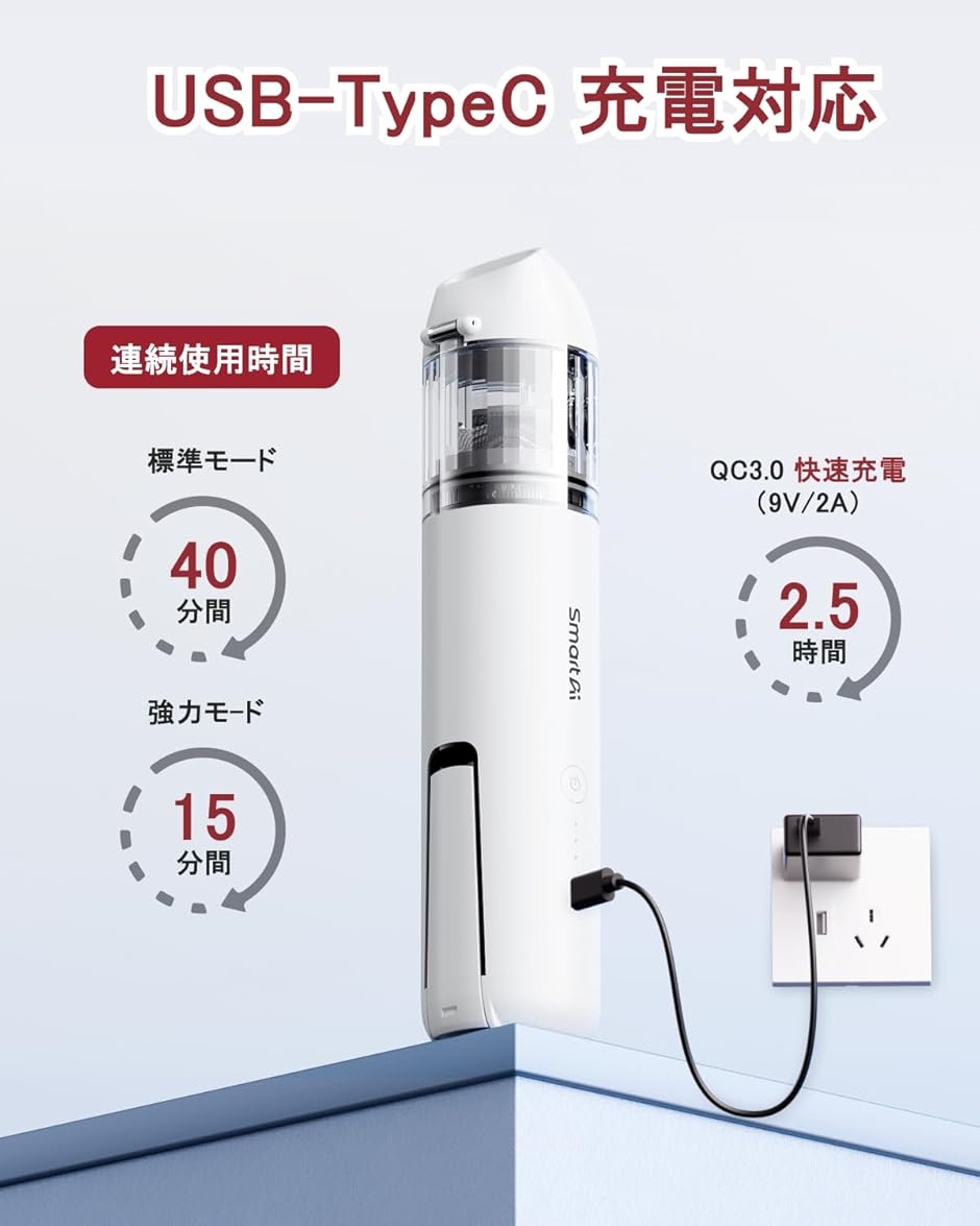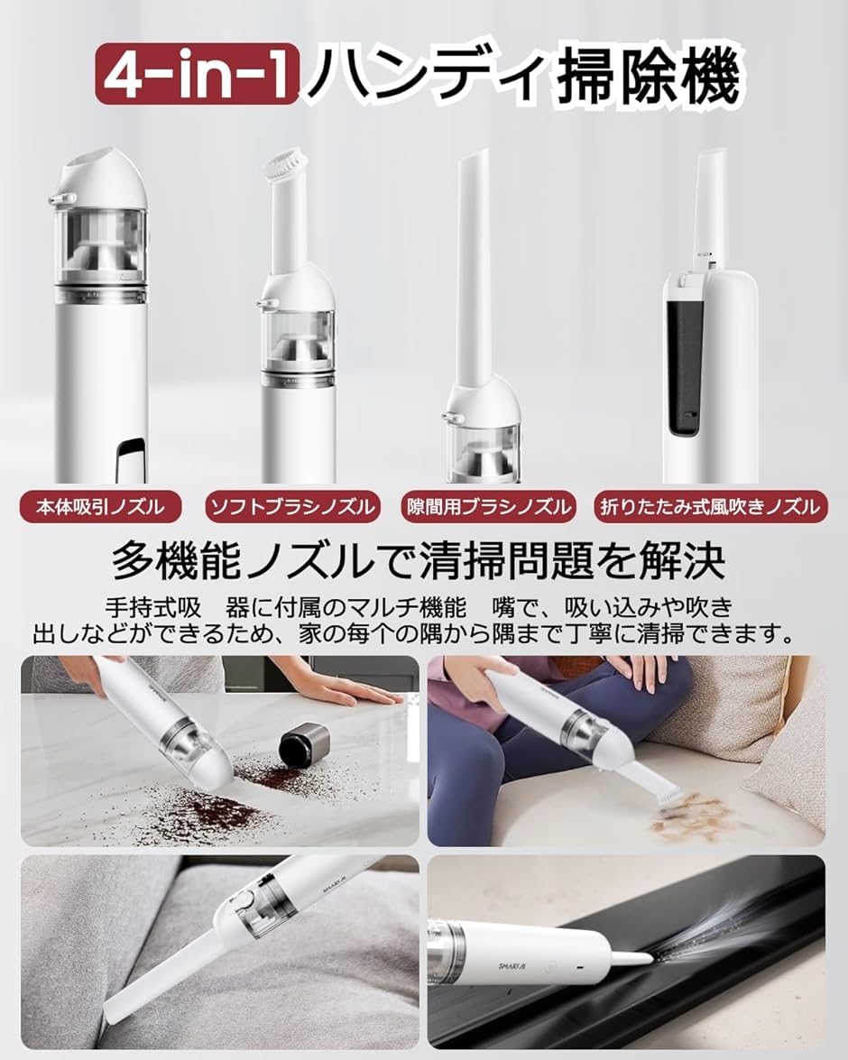 - 商品コード2b93wffcyx商品名ハンディクリーナー 車用掃除機 16000Pa 強力吸引 40分連続稼働 4in1電動車載ミニポータブルコードレス掃除機 折りたたみ式ブロワー搭載 USB充電 0.5kg超軽量 静音 小型 業務用/キーボード掃除/車内清掃/家具/家庭用 H3ProブランドSmartAIカラーホワイトサイズ等26.5x5.8cm「16000Pa強力な吸引力・静音」SmartAI H3は、120Wのブラシレス高速モーターを搭載しています。回転数は最大80000rmpまで高速で、16000Paの強力な吸引力を実現し、お手軽に車内、家庭、またはオフィスの食べかす、ペットの毛、ほこり、砂などの汚れを掃除します。「多機能4in1車用掃除機」H3Pro附帯の2つの異なるブラシヘッドに加えて、本体の前部には吸塵ノズルが装備されており、末端には折りたたみ可能なノズルも備わっています。手持ちの掃除機だけでなく、エアダスターやポンプとしても使用できます。ゴミを吸い取るだけでなく、隙間のホコリを吹き飛ばしたり、風船に空気を入れたりすることができます。これは非常に便利な掃除機で、どんな隅々やすきまにも簡単に清掃できます。「高速充電・長時間連続運転」H3Proは、クイック充電に対応したハンディクリーナーで、わずか2.5時間で充電が完了します。付属のUSB-C充電ケーブルを使用して、車や家のどこでもUSBポートを利用して充電できます(充電中は使用しないでください)。8000mAhの大容量バッテリーが内蔵されており、標準モードでは最大40分間の連続使用が可能です。「便携・小型掃除機」超薄26.5センチx5.8センチのデザインで、便利な掃除機は専用の収納袋が付いており、ミニマムなデザインで包みや引き出しに簡単に収納でき、車、家庭、またはオフィスで欠かせない便利な掃除ツールになります。超軽量で約500gのため、女性、子供、お年寄りでも片手で簡単に使用できます。さらに、コードレス設計なので、どんな角でも簡単に持ち運びできます。「ダブルフィルター・簡単清掃」ステンレス製フィルターネットとHEPAフィルターを採用し、より効果的に不純物をろ過し、微粉塵、花粉などのアレルゲンを捕捉して清浄な空気を放出します。120mlのダストボックスは一つのボタンでゴミを傾け、ボタンを押すだけでダストカップを開くことができ、ゴミを捨てるときも手を清潔に保ちます。ダストボックスとフィルターは簡単に取り外し、水洗いが可能で繰り返し使用できます。※ 他ネットショップでも併売しているため、ご注文後に在庫切れとなる場合があります。予めご了承ください。※ 品薄または希少等の理由により、参考価格よりも高い価格で販売されている場合があります。ご注文の際には必ず販売価格をご確認ください。※ 沖縄県、離島または一部地域の場合、別途送料の負担をお願いする場合があります。予めご了承ください。※ お使いのモニタにより写真の色が実際の商品の色と異なる場合や、イメージに差異が生じることがあります。予めご了承ください。※ 商品の詳細(カラー・数量・サイズ 等)については、ページ内の商品説明をご確認のうえ、ご注文ください。※ モバイル版・スマホ版ページでは、お使いの端末によっては一部の情報が表示されないことがあります。すべての記載情報をご確認するには、PC版ページをご覧ください。