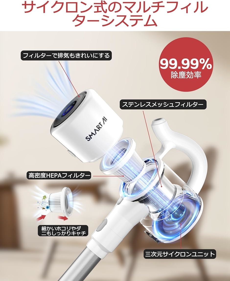 「掃除機 33KPa 強力吸引力」SmartAIサイクロン掃除機は、強力な300Wのブラシレスモーターを搭載し、サイクロン式遠心分離技術を組み合わせ、卓越な33,000Paの超強力な吸引力を実現しています。