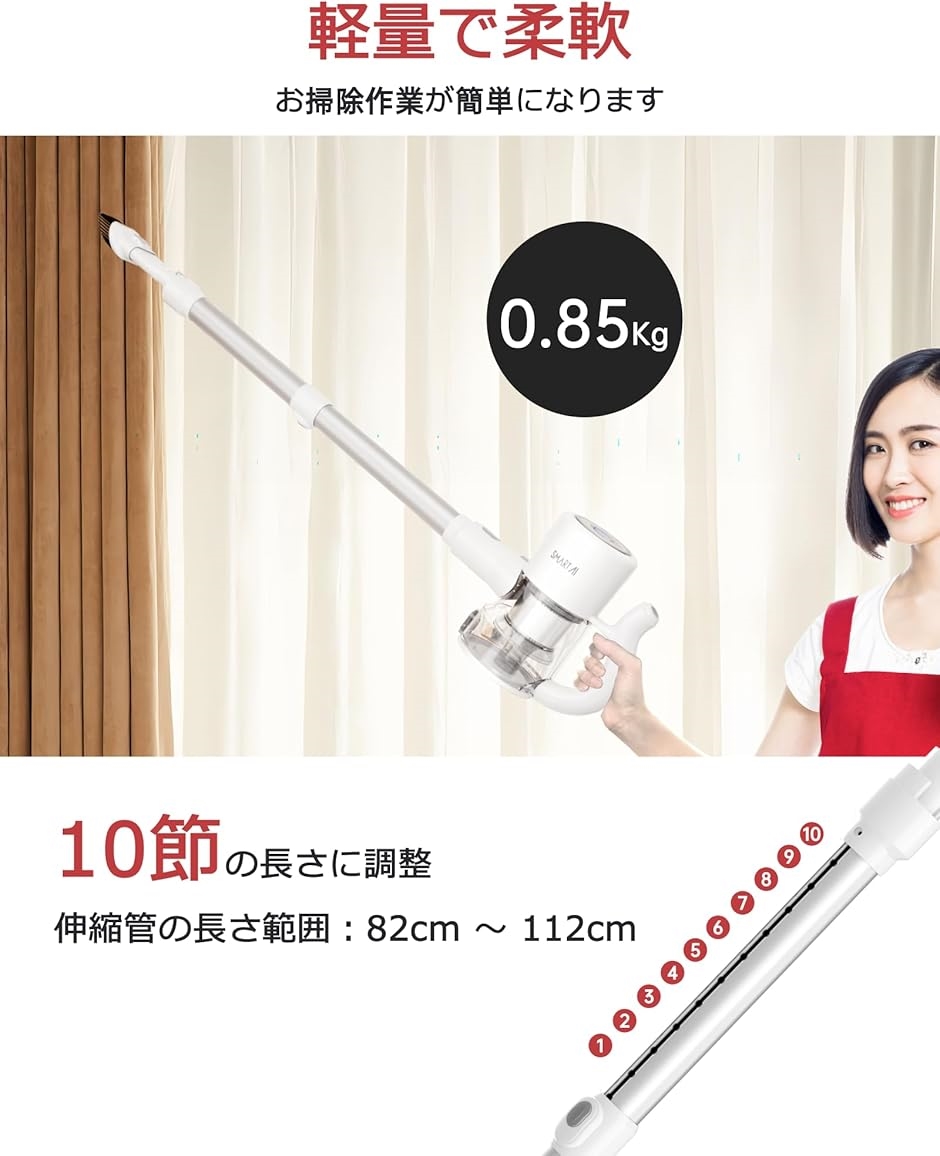 「調節可能なパイプ・携帯式掃除機」軽量掃除機の本体はわずか0.85kgで、10段階で伸縮可能なパイプが付属しています。