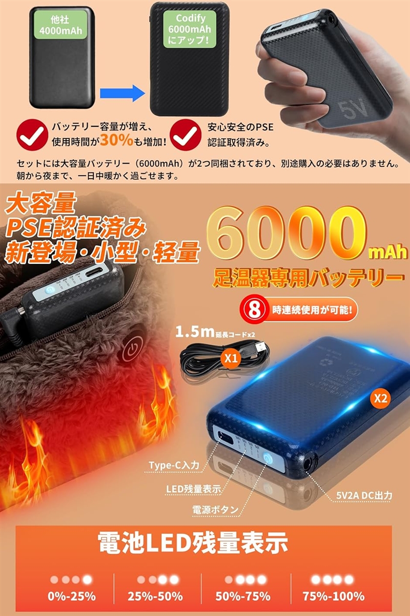 「PSE認証大容量バッテリー&3段階温度調節」日本のPSE認証を取得した6000mAhの大容量バッテリーが2つ付属しています。