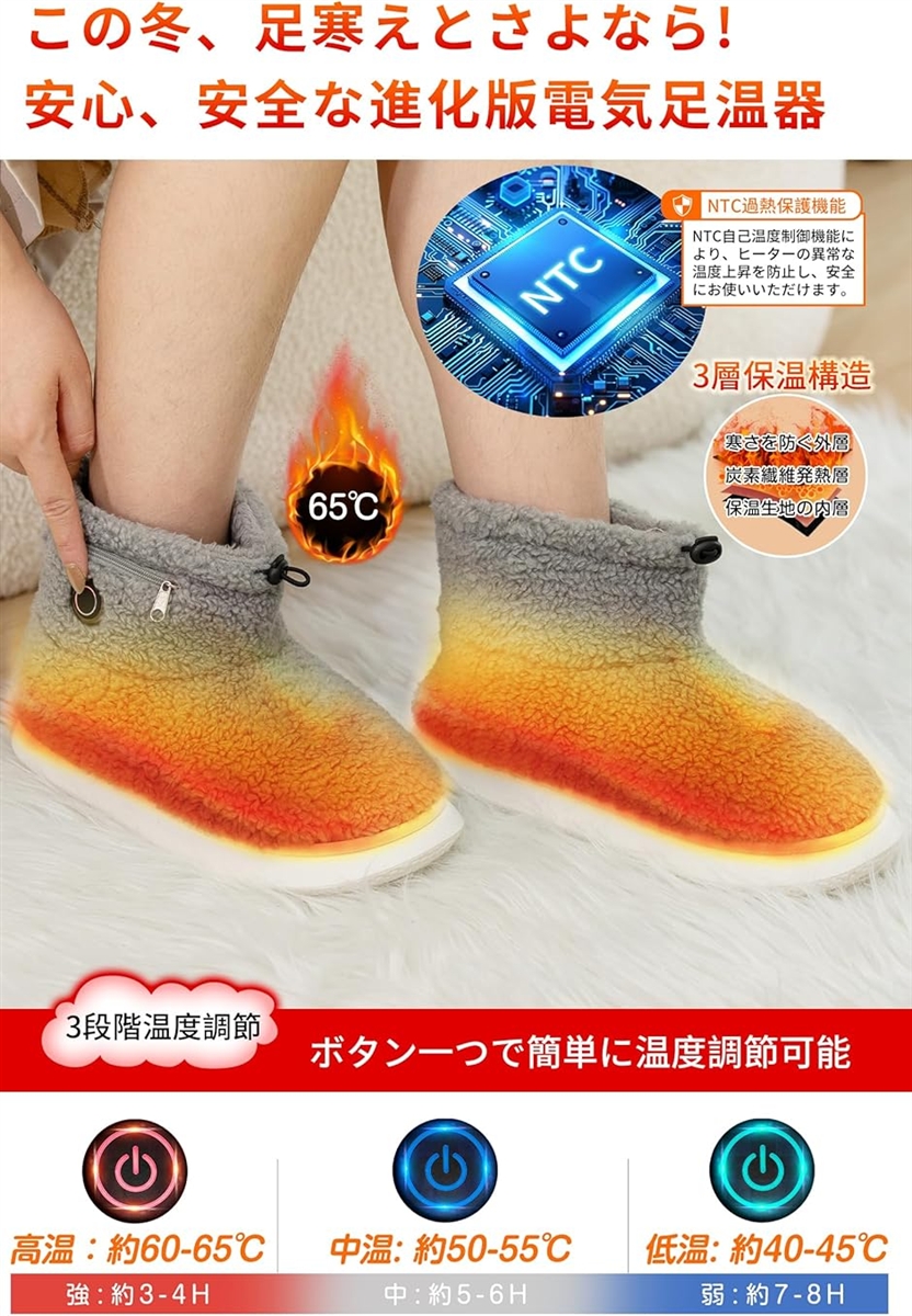電気スリッパ フットウォーマー ル6000mAh大容量x2個 & 8秒速暖 足温器 (グレー-第二世代, M(22.5-25cm))