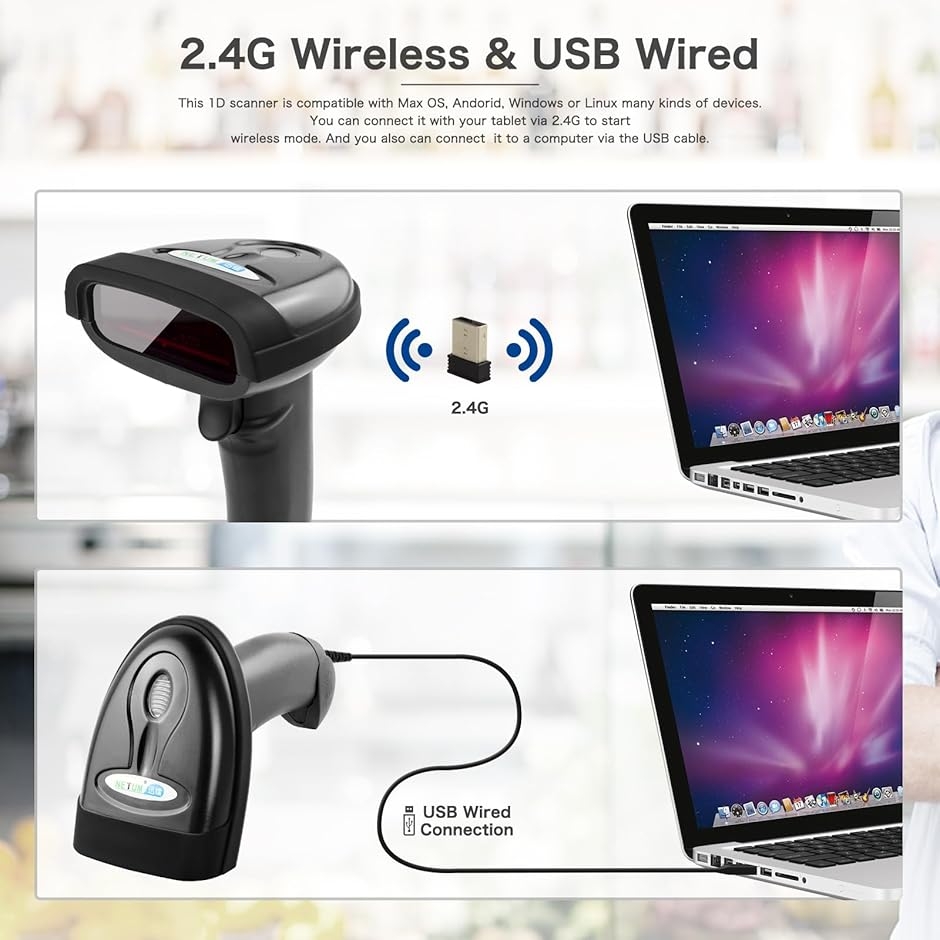 バーコードリーダー USB 1D バーコードスキャナー ワイヤレス2.4GHz 手持ち 充電式 有線/無線対応 (NT-1698W)