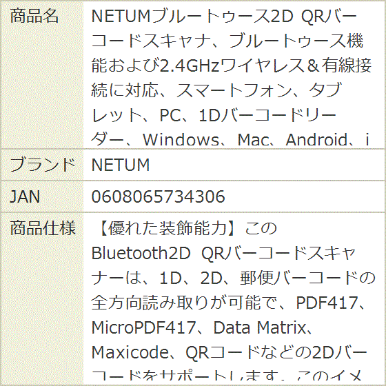 - カラー:NT-1228BL◆商品名:NETUMブ ルー ト ゥースバー コードスキャナー 2D QRコードリーダー、ブ ルー ト ゥース機能および2.4GHzワイヤレス&有線接続に対応、スマートフォン、タブレット、PC、Windows、Mac、Android、iOSで動作【優れた装飾能力】このバー コードリーダー bluetoothは、1D、2D、郵便バー コードの全方向読み取りが可能で、PDF417、MicroPDF417、Data Matrix、Maxicode、QRコードなどの完全な2Dバー コードをサポートします。このイメージバー コードスキャナーは、バー コードを読み取るだけではありません。紙からだけでなく、電話、ラップ、またはPC画面からも使用できます。店舗でのモ バ イ ル決済に非常に便利です。【3in1Bluetoothワイヤレス接続】このバー コードリーダーは、Bluetooth、2.4Gワイヤレスレシーバー、有線接続をサポートしています。ノートパソコン、PC、携帯電話、タブレット、I P h o n e、iPad、POSに簡単に接続できます。 Windows XP / 7/8/10、Mac OS、Windows Mobile、Android OS、iOSで動作します【インスタントアップロードモード&ストレージモード】:ワイヤレスバー コードスキャナーには2つのアップロードモードがあります。内部オフラインストレージは、オフラインストレージモードで最大130,00のバー コードをサポートします。デバイスの受信機から遠く離れた場所でバー コードをスキャンして保存し、更新します。【長時間稼働&高速スキャン】:1800mAhバッ テ リー内蔵で、9時間の連続スキャンと4時間のフル充電後2ヶ月のスタンバイに対応。スキャン速度は最大200回/秒です。このバー コードリーダー ワイヤレスは、スーパーマーケット、薬局、パン屋、書店、ファッション店、タ バ コ屋、雑誌キオスクなどのPOSシステムに適用されます。