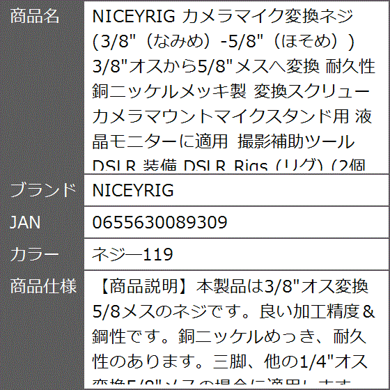 カメラマイク変換ネジ 3/8 なみめ-5/8 ほそめ 3/8オスから5/8メスへ変換 耐久性 銅ニッケルメッキ製 装備(ネジ―119)
