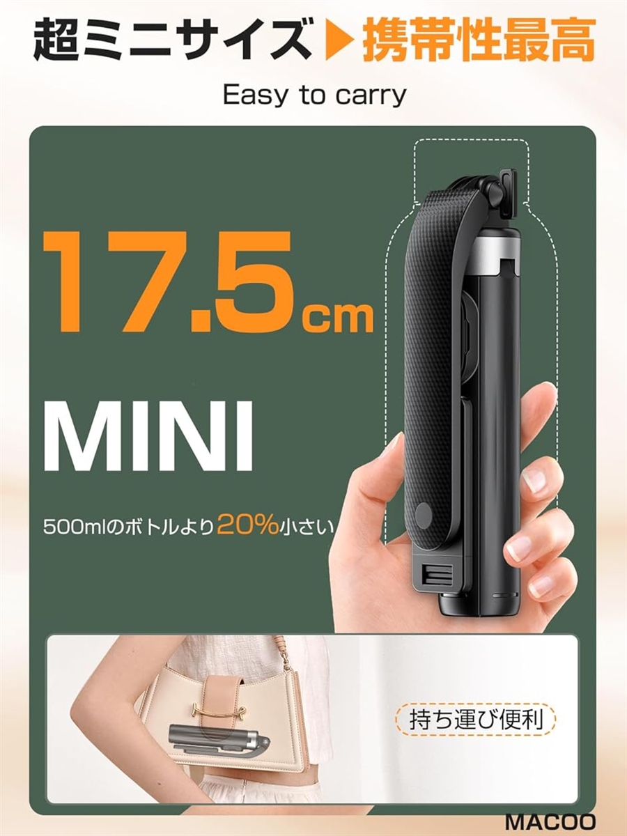 - 商品情報 商品の説明 自撮り棒 スマホスタンド スマホ 三脚 コンパクト じどり棒 iphone 携帯スタンド 軽量 セルカ棒 自撮り棒 三脚 自 撮り 棒 bluetooth カメラスタンド selca棒 iphone 三脚 スマホ用 じどりぼう スマホ android 人気 自撮り棒 おすすめ セルフィースティック スマホ撮影スタンド セルフィー gopro 三脚 カメラ対応 selfie stick 自撮り 撮影 主な仕様 【安定性を新たな次元へ】長年にわたり、MACOOは新設計と安定性を一体にした自撮り棒を追求し続けます。2023年業界初「四脚安定モデル」自撮り棒がついに新登場へ!従来の三脚式じどり棒と異なる、安定感が高い「四つ脚」と「加強レバー」を施すことにより、ダブル安定構造で耐荷重が高かったのは20kg、iphone proシリーズや重いカメラなどに接続してもOK!更に底部はシリコンバンドが付き、滑りやすい環境でも、風が吹いていても、不安定な岩場でも安定した撮影ができます。【コンパクトながら広い撮影範囲】お客様のご要望にお応えし、安定性を追求しつつも、サイズも極限まで小さくしました。自撮り棒は家から持ち出して使うことが多いアイテムなので、携帯性や撮影範囲も選ぶ際の重要な要素となります。MACOOの自撮り棒は折り畳んだ状態で17.5cm、500mlのペットボトルよりも小さい、約103cmまで9段階伸縮可能なロングタイプで、家族や友人とのデートの際、いつでも取り出せるようにポケットに入れて、皆様と素敵な瞬間を記録できます!【業界トップチップBluetooth5.2、瞬間接続】Bluetooth接続タイプの自撮り棒は主流となりつつあるが、市販商品は接続不安定な悩みに困っています。MACOOセルカ棒は業界最先端Bluetooth5.2技術を採用、3秒に瞬間接続可能、一度接続したスマホをリモコンが自動記憶して、次回から自動的にペアリングできます。約10m先から遠隔撮影可能、旅先やパーティなどみんなでポーズをとって撮影したい場合は、MACOO自 撮り 棒は欠かせない1つとなっています。【様々な形で撮影を楽しめる】一体化になるデザインで、自撮り棒としてだけでなく、スマホスタンドとして動画鑑賞、集合写真、生放送、オンライン会議などにも適用です。スマホを接続できるのはもちろん、デジカメに対応出来るネジ・アダプター付き、撮影が好きな方にとって便利なアイテムです。360度回転するホルダー部分に加えて、ヘッド部分は225度まで折りたたむ形で角度の調整ができます。縦、横向きなど、さまざまなアングルでの撮影を楽しめます。【最高なユーザー体験、多機種対応】自撮り棒のBluetoothはiPhoneとAndroid両方のOSで使用できるで、友達や家族と共有できるので便利です。横幅62mm-100mmのスマホを自撮り棒のホルダーに装着するのが可能、小さい端末でも、大画面の端末でもしっかり固定できます!市場で類似品と模倣品は多いですが、「見た目が同じように感じても、驚くほど性能に差があり、お客様の最高なユーザー体験のために、是非MACOOを見定めてご購入ください。無期限のカスタマーサポートで、万が一製品に関する問題ありましたら、弊店にご連絡頂ければ弊社より早速に解策をご案内します。 # 【送料無料】MACOO 自撮り棒 【業界超ミニ?四脚モデル】 スマホスタンド 安定性アップ iphone android 三脚 コンパクト 軽量 「2023極上の新設計」 自撮りをする際、「自撮り棒が不安定でうまく撮れない」と悩む方も多いのではないでしょうか。そのフラストレーションは、友達や家族との大切な瞬間を楽しむ時間を奪っていますよね。MACOOの自撮り棒は、そんな悩みを解消するために開発された商品です。この自撮り棒は、業界初の四脚モデルを採用し、驚異的な安定性を持っています。最大103cmまで伸びるこの自撮り棒は、さまざまな場面での撮影をサポートします。家族との旅行や友達とのパーティーでの思い出を、しっかりと記録することが可能です。軽量で持ち運びも楽々なので、どんなシーンでも活用できるでしょう。一度使ってみると、その便利さにきっと驚かれることと思います。 ## 360度の柔軟な撮影アングル 撮影時に最適な角度を見つけるのは簡単ではありません。特に自撮り棒を使用する際、角度調整の難しさに直面することが多いです。しかし、MACOOの自撮り棒は、360度回転するホルダー部分と225度までの角度調整が可能なヘッドを搭載しています。これにより、縦向き、横向き、さらには俯瞰や拾い上げる角度まで、多種多様なアングルでの撮影が可能です。これまで自撮り棒では難しかったアングルでも、簡単に調整できるので、撮影の幅が大きく広がります。これにより、友達や家族との思い出の一枚も、あなたの理想通りの形で残すことができます。作品とも言えるイトーニングアングルで、自撮りが楽しめるのは、確かに魅力的です。 さらに、撮影をするシチュエーションも選びません。この自撮り棒は、デジカメやアクションカメラにも対応しており、幅広い撮影体験ができるのも強みです。特に旅行のお供としてもおすすめです。最
