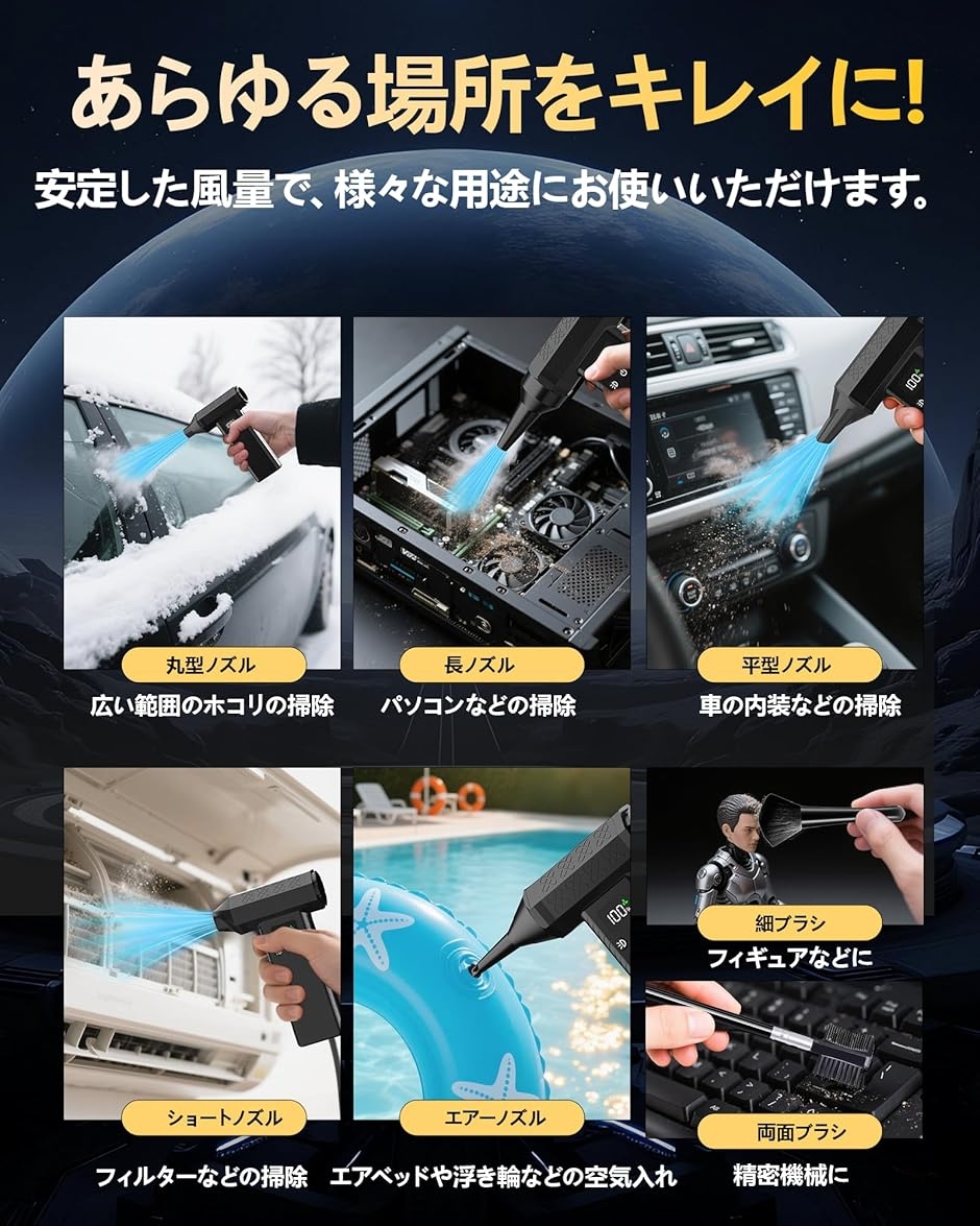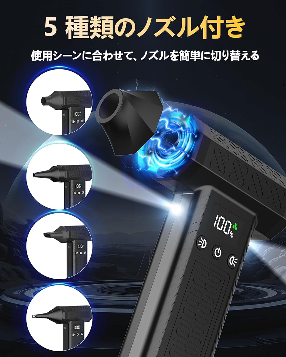 「5種類のノズル付き&高輝度LEDライト2つ搭載」使用シーンに合わせて、ノズルを簡単に切り替えて、あらゆる場所をキレイに. 丸型ノズル:広い範囲のホコリの掃除。