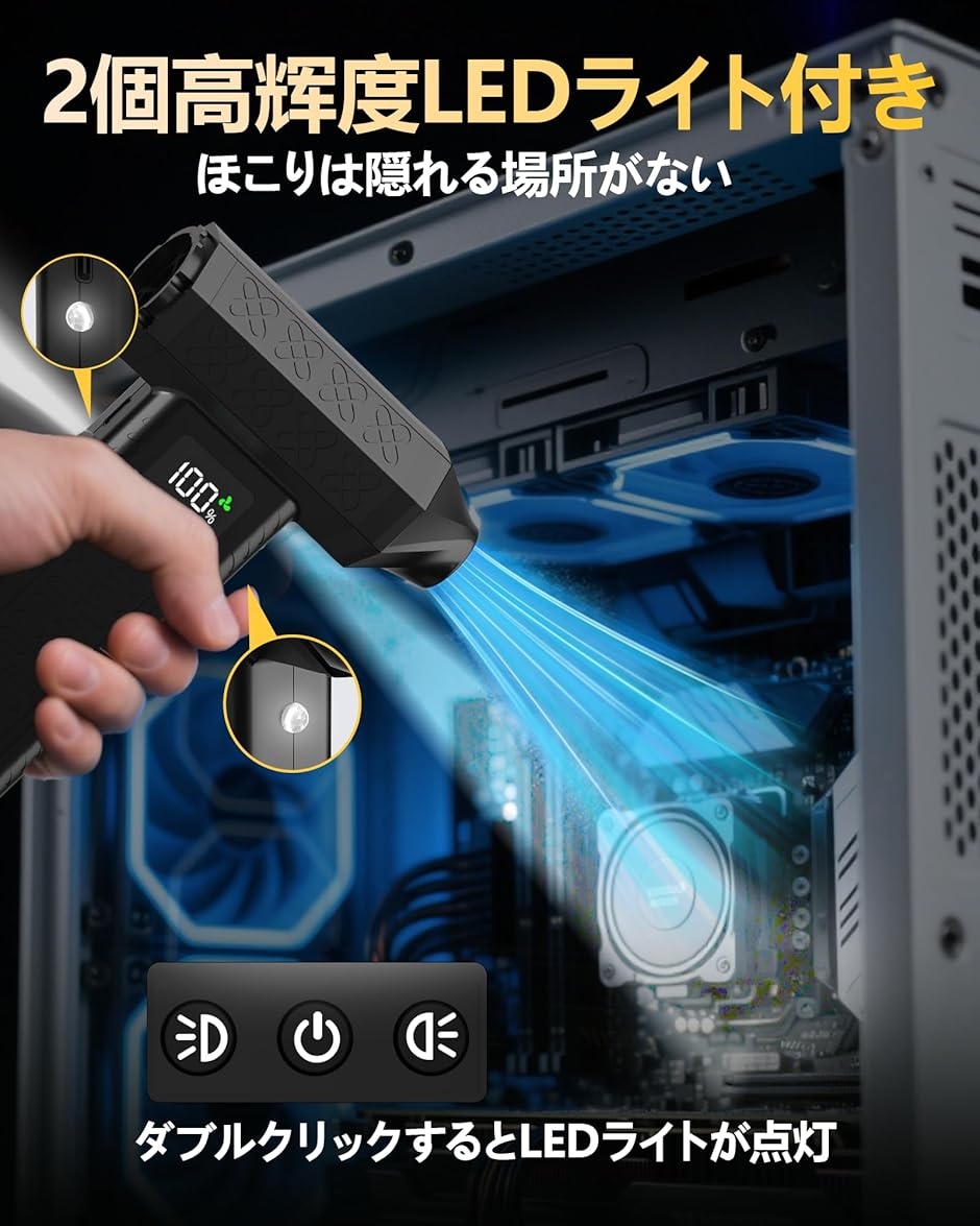 「30,0000rpmエアダスター・最高120m/sに達する暴風・3段階調整」長年にわたり高度なパワーエレクトロニクス技術を磨いてきており、独自開発したブラシレス DC モーター技術を製品に投入し、最高回転速度は30,0000RPM まで向上させ、活用範囲を広げると同時に、元の風速段階調整機能も保ち、風量を利用シーンに合わせてお好みの強さに 3 段階で調整できます。