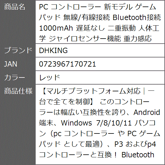 - バリエーションコード : 2brvsrtudt商品コード2brwpyfq6v商品名PC コントローラー 新モデル ゲームパッド 無線/有線接続 Bluetooth接続 1000mAh 遅延なし 二重振動 人体工学 ジャイロセンサー機能 重力感応ブランドDHKINGカラーレッド「マルチプラットフォーム対応|一台で全てを制御」 このコントローラーは幅広い互換性を誇り、Android 端末、Windows 7/8/10/11 パソコン(pc コントローラー や PC ゲームパッド として最適)、P3 およびp4 コントローラーと互換。 Bluetooth 接続により、スマートフォン、タブレット、据え置きゲーム機など、所有する様々なデバイスを一台で操作可能に。ワイヤレスコントローラーの自由さと多機能を兼ね備え、ユーザーのプレイ環境を選ばず、ゲームライフの中心となる信頼できる入力デバイスを提供します。「超長続航 + 急速充電|中断なきプレイ」 コントローラーに大容量バッテリーを内蔵し、最大 20 時間の連続プレイを実現。⚡ たった 2 時間の急速充電でフル充電完了、ゲームの流れを長時間途切らせることなく没入感を維持。さらに低電圧アラート機能を搭載 —— バッテリー残量が低下すると本体インジケーターランプが点滅警告。PC ゲームパッド や p4 コントローラー、pc コントローラーとして使用時も、予期せぬ充電切れを防ぎ、安心してプレイに集中できます。「マルチ機能搭載|リアルなゲーム体験」 このコントローラーは、ゲームの臨場感を引き出す機能を集約。️ 双振動モーターで繊細な衝撃や動作を伝え、内蔵スピーカーと 3.5mm オーディオジャック(ヘッドセット対応)で音響体験を向上。6 軸ジャイロセンサーによる直感的モーション操作、専用シェアボタンでの瞬間記録機能も搭載。ワイヤレスコントローラーとしての自由さに加え、PC ゲームパッド や pc コントローラー、p4 コントローラーとして使用時も、あらゆるシーンで「リアルな感覚」「快適な操作」「簡単な共有」を同時に実現します。「安定高速接続|2 種類モード切り替え」 コントローラーは有線 / 無線の 2 種類接続モードを装備。 競技シーンでは USB-C ケーブル有線接続で応答ゼロを実現(pc コントローラー や PC ゲームパッド として最適)。日常プレイ時は、10 メートル広範囲をカバーする強力な Bluetooth 無線接続にワンタッチ切り替え ——ワイヤレスコントローラーの自由さで、ソファやベッドで自由な姿勢でプレイ可。複数台デバイス(PC/Switch/ スマートフォン等)の登録・切り替えも簡単、p4 コントローラーとしての使用から PC ゲームまで、シームレスに切り替えられます。「人間工学設計|長時間快適握持」 コントローラーは人間工学に基づいた最適化設計。 テクスチャードグリップが指にフィットし、滑らかな触感で手の形状に馴染む。両端の滑り止め加工で、手のひらに汗をかいても滑りを防止 —— 長時間のゲームプレイでも疲れにくい快適さを維持。大容量バッテリーと急速充電(2 時間フル充電 / 最大 20 時間連続使用)、低電圧警報機能も搭載。PC ゲームパッド や p4 コントローラー、pc コントローラー、ワイヤレスコントローラーとして使用しても、機能性と握持感を両立した理想的なデザインです。※ 他ネットショップでも併売しているため、ご注文後に在庫切れとなる場合があります。予めご了承ください。※ 品薄または希少等の理由により、参考価格よりも高い価格で販売されている場合があります。ご注文の際には必ず販売価格をご確認ください。※ 沖縄県、離島または一部地域の場合、別途送料の負担をお願いする場合があります。予めご了承ください。※ お使いのモニタにより写真の色が実際の商品の色と異なる場合や、イメージに差異が生じることがあります。予めご了承ください。※ 商品の詳細(カラー・数量・サイズ 等)については、ページ内の商品説明をご確認のうえ、ご注文ください。※ モバイル版・スマホ版ページでは、お使いの端末によっては一部の情報が表示されないことがあります。すべての記載情報をご確認するには、PC版ページをご覧ください。技術基準適合証明番号:210-179003