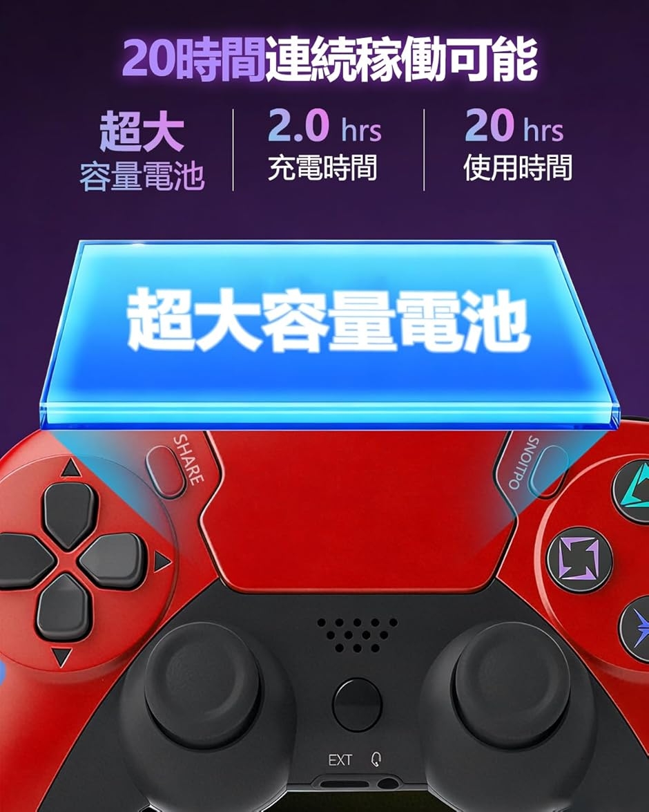 「超長続航 + 急速充電|中断なきプレイ」? コントローラーに大容量バッテリーを内蔵し、最大 20 時間の連続プレイを実現。? たった 2 時間の急速充電でフル充電完了、ゲームの流れを長時間途切らせることなく没入感を維持。