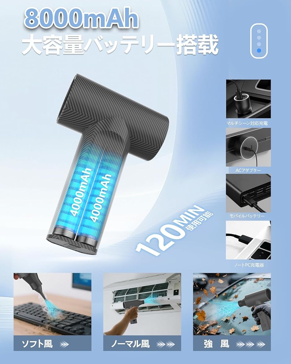 エア缶の廃棄問題から解放される環境に優しくエコ設計ながら、オフィスや車内メンテナンス、アウトドアなど多シーンで途切れない稼働を実現します。