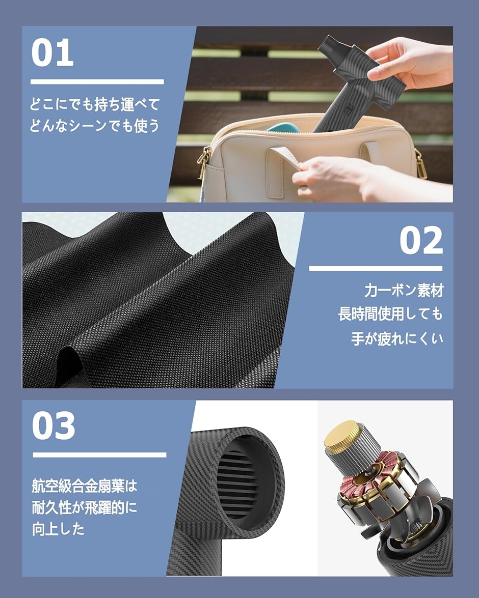 - バリエーションコード : 2bu3vnutrp商品コード2budvyvxsj商品名電動エアダスター 300000RPM高速回転 ブロワー 無段階風量調節 強力 カーボン筐体 手持ち 吹き飛ばし エアダスター ミニジェットファン 小型 8000mAhブランドFUSSOPカラーブラックサイズ等中「プロ仕様のパワー」ブラシレスモーター搭載で、効率的と高出力の両立を実現。空気運動エネルギー効率を従来比130%向上させつつ、騒音は低減した革新設計。瞬間最大風速40m/sの超集中気流が、鍵盤の溝や基板の微細な隙間に潜む頑固な埃を一掃。従来の「風力不足で吹き飛ばせない」という課題を克服した、風圧性能を誇ります。モーター耐久性を150%向上させたことで連続使用に強く、消費電力30%削減によるエコ運転も可能に。「長時間駆動&マルチ充電対応」大容量8000mAhバッテリー搭載で、連続使用時でも持続力抜群。USB-C急速充電に対応し、PC/モバイルバッテリー/車載充電器などあらゆる電源から即座に補給可能。エア缶の廃棄問題から解放される環境に優しくエコ設計ながら、オフィスや車内メンテナンス、アウトドアなど多シーンで途切れない稼働を実現します。充電1回で日常使いからプロユースまでをカバーする、次世代型の持続性能です。「プロから家庭まで使えるマルチパーパス性能」エアダスターはインフレータブルグッズの膨張補助からBBQ炭おこし、多肉植物の水滴除去まで、幅広いシーンで活躍。精密機器のメンテナンスではカメラレンズのホコリ除去やプリント基板の清掃に最適。生活シーンではカーペットの細かなゴミやソファの隙間掃除、車内のエアコン吹出口クリーニングをサポート。DIY作業時には木工鉋屑の除去や窓シャッターの溝掃除にも威力を発揮。オフィス環境ではキーボードのパン粉除去からPC内部の埃対策まで、プロ仕様の風圧で従来手の届きにくかった部分まで徹底クリーンアップ。あらゆる「吹き飛ばしたい」「きれいにしたい」に応えるツールです。「どこでも手軽に使える携帯性」エアダスターは手のひらにすっぽり収まるコンパクトサイズ(16x10x3.6cm)で、重量わずか277g。スリムなボディはポケットやバッグの隙間にもすんなり収納でき、外出先でもサッと取り出して使用可能です。握りやすい形状と軽量ボディで、長時間の連続使用でも手首や指への負担を軽減。ストレスのない操作性で、狭い隙間の掃除もスムーズにこなせます。日常のお手入れからプロフェッショナルなメンテナンスまで、快適な使い心地を長期間持続する工夫が詰まった一台です。「充実のセット内容」商品にはエアダスター本体に加え、Type-C充電ケーブル・日本語説明書・2種類のノズル・クリーニングブラシが全て同梱。高品質バッテリー搭載で、日常のお手入れから精密機器のメンテナンスまで安心してお使いいただけます。※ 他ネットショップでも併売しているため、ご注文後に在庫切れとなる場合があります。予めご了承ください。※ 品薄または希少等の理由により、参考価格よりも高い価格で販売されている場合があります。ご注文の際には必ず販売価格をご確認ください。※ 沖縄県、離島または一部地域の場合、別途送料の負担をお願いする場合があります。予めご了承ください。※ お使いのモニタにより写真の色が実際の商品の色と異なる場合や、イメージに差異が生じることがあります。予めご了承ください。※ 商品の詳細(カラー・数量・サイズ 等)については、ページ内の商品説明をご確認のうえ、ご注文ください。※ モバイル版・スマホ版ページでは、お使いの端末によっては一部の情報が表示されないことがあります。すべての記載情報をご確認するには、PC版ページをご覧ください。