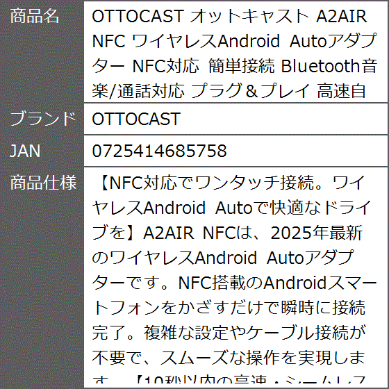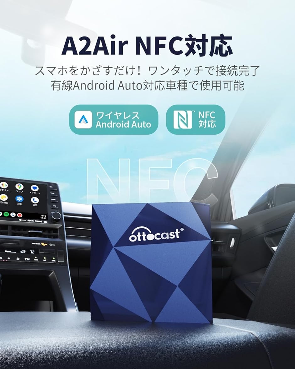 オットキャスト A2AIR NFC ワイヤレスAndroid Autoアダプター NFC対応 簡単接続 Bluetooth音楽/通話対応 MDM