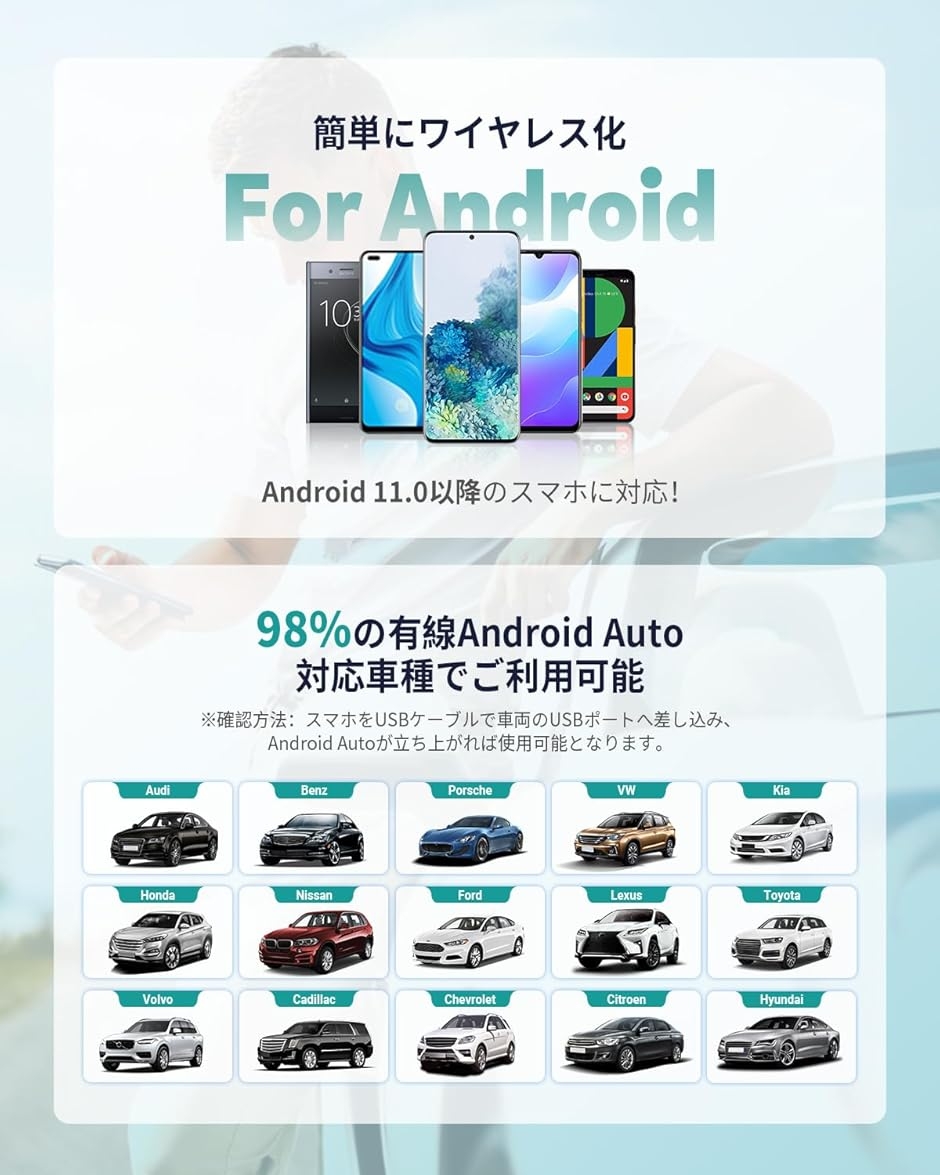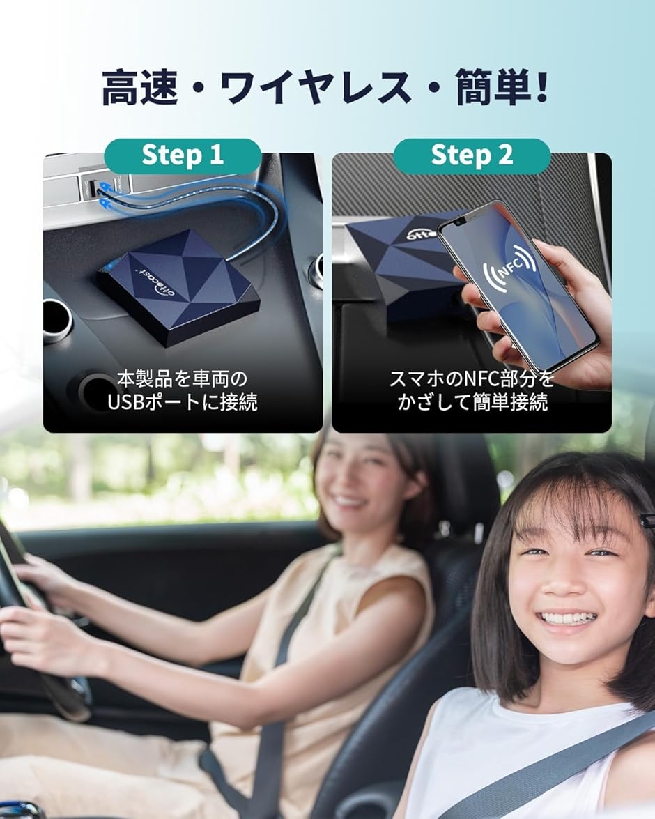 ワイヤレスAndroid Autoで快適なドライブを」A2AIR NFCは、2025年最新のワイヤレスAndroid Autoアダプターです。