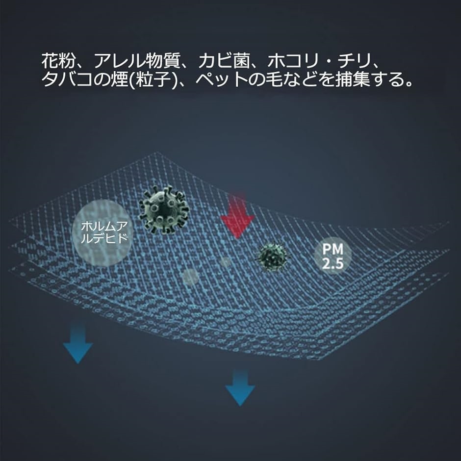 「集じん機能」 集じんフィルターに添着したバイオ防菌、スーパーアレルパスターの働きで、空気中に浮遊している細かい粒子(埃、花粉、細菌、カビ菌、タバコの煙、ダニの死骸など)を濾過し、室内の空気をきれいにします。
