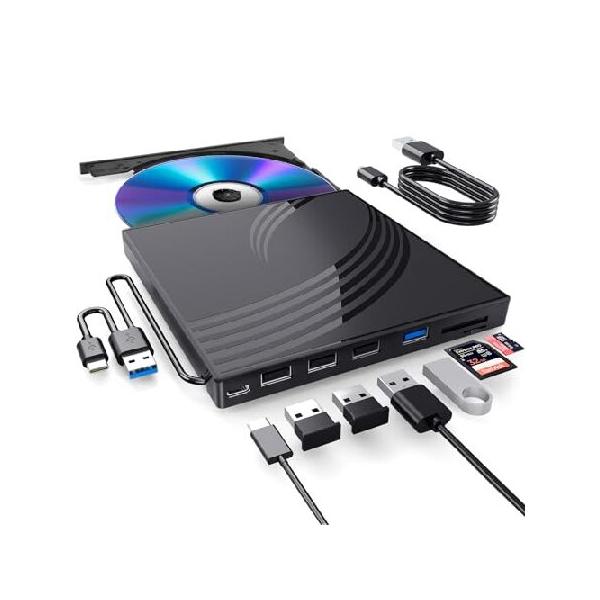 【並行輸入品】 外付けCD/DVDドライブ ノートパソコン用 ウルトラスリム CDバーナー USB 3.0ハブ USBポート4個 TF/SDカードスロット2個 Type-Cポート1個 ノート