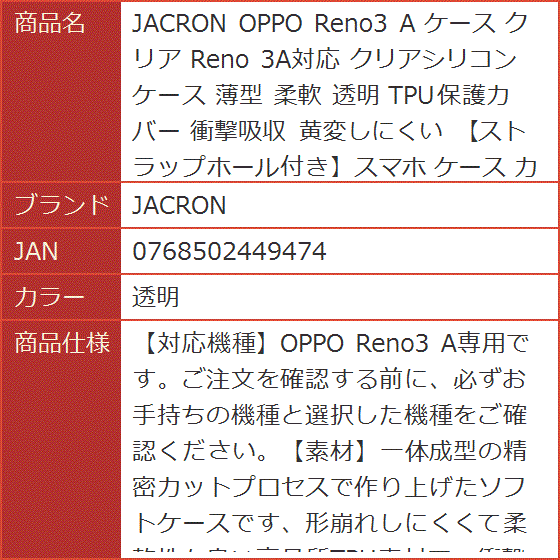 - 商品コード2bjupwsi1o商品名OPPO Reno3 A ケース クリア Reno 3A対応 クリアシリコンケース 薄型 柔軟 透明 TPU保護カバー 衝撃吸収 黄変しにくい ストラップホール付きスマホ ケース カバーブランドJACRONカラー透明「対応機種」OPPO Reno3 A専用です。ご注文を確認する前に、必ずお手持ちの機種と選択した機種をご確認ください。「素材」一体成型の精密カットプロセスで作り上げたソフトケースです、形崩れしにくくて柔軟性も良い高品質TPU素材で、衝撃吸収と衝撃耐性が強化されます。透き通るクリア素材を採用し、本体のデザインと色合いをほぼ損なわずそのまま保ちます。しかも超軽量化でぜひ長くご愛用いただけましょう。「全面保護」ケースは柔らかいTPU素材を使用し、本体との擦れを防げ、ケースの着脱も簡単にできます。落下時には衝撃力を分散し、大事なデバイスを全面保護します。「スマホを輝かせる高透明クリアケース」本体の鮮やかな色をそのままに映し出すことができ、端末オリジナルカラーを損ねません。本体にフィットするとともに、持ったときのフィット感を感じられます。「精確的なデザイン」柔らかい素材なので、着脱も簡単です。本物のマシンで金型を作り、箱が取り付けられていても、各種のボタン操作ができます。操作性を高める。コートを着て全部操作できます。※ 他ネットショップでも併売しているため、ご注文後に在庫切れとなる場合があります。予めご了承ください。※ 品薄または希少等の理由により、参考価格よりも高い価格で販売されている場合があります。ご注文の際には必ず販売価格をご確認ください。※ 沖縄県、離島または一部地域の場合、別途送料の負担をお願いする場合があります。予めご了承ください。※ お使いのモニタにより写真の色が実際の商品の色と異なる場合や、イメージに差異が生じることがあります。予めご了承ください。※ 商品の詳細(カラー・数量・サイズ 等)については、ページ内の商品説明をご確認のうえ、ご注文ください。※ モバイル版・スマホ版ページでは、お使いの端末によっては一部の情報が表示されないことがあります。すべての記載情報をご確認するには、PC版ページをご覧ください。