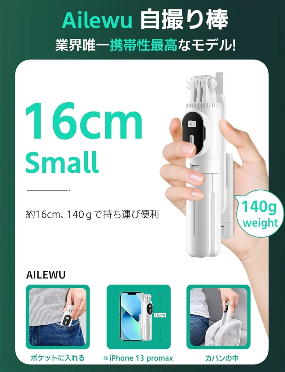 「軽量、ポケットサイズ」Ailewuは自撮り棒を使用するシーンを考えて、数え切れないほどの実験の経て、自撮り棒の機能が満たされている状態で更に小型に進化しました。