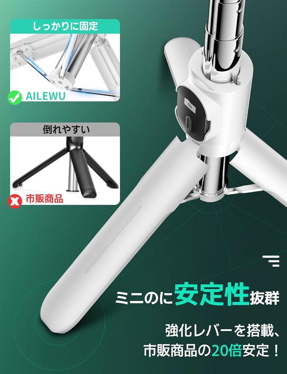 Ailewu自撮り棒の三脚は頑丈な傘状構造が搭載、底部は滑り止めゴム素材の使用で、ダブル安定感が実現、倒れのことがありません。