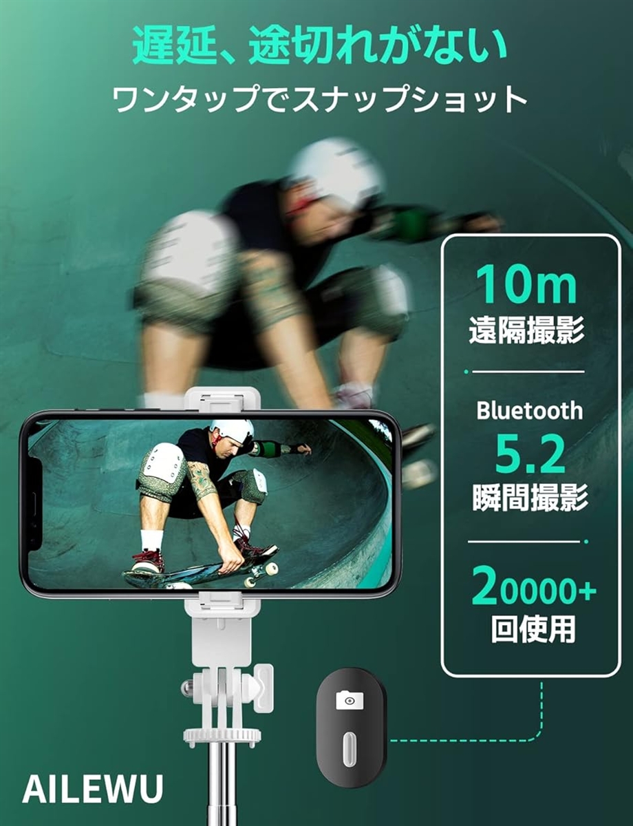 「0遅延で写真を撮れる」自撮り棒の無線リモコンは最先端ブルートゥース5.2技術を採用、通信範囲や伝送速度が大幅にアップするため、境に左右されない優れた接続安定性を実現していて、ワンタップですぐに撮れる、 - 楽天での商品説明(ホリック)