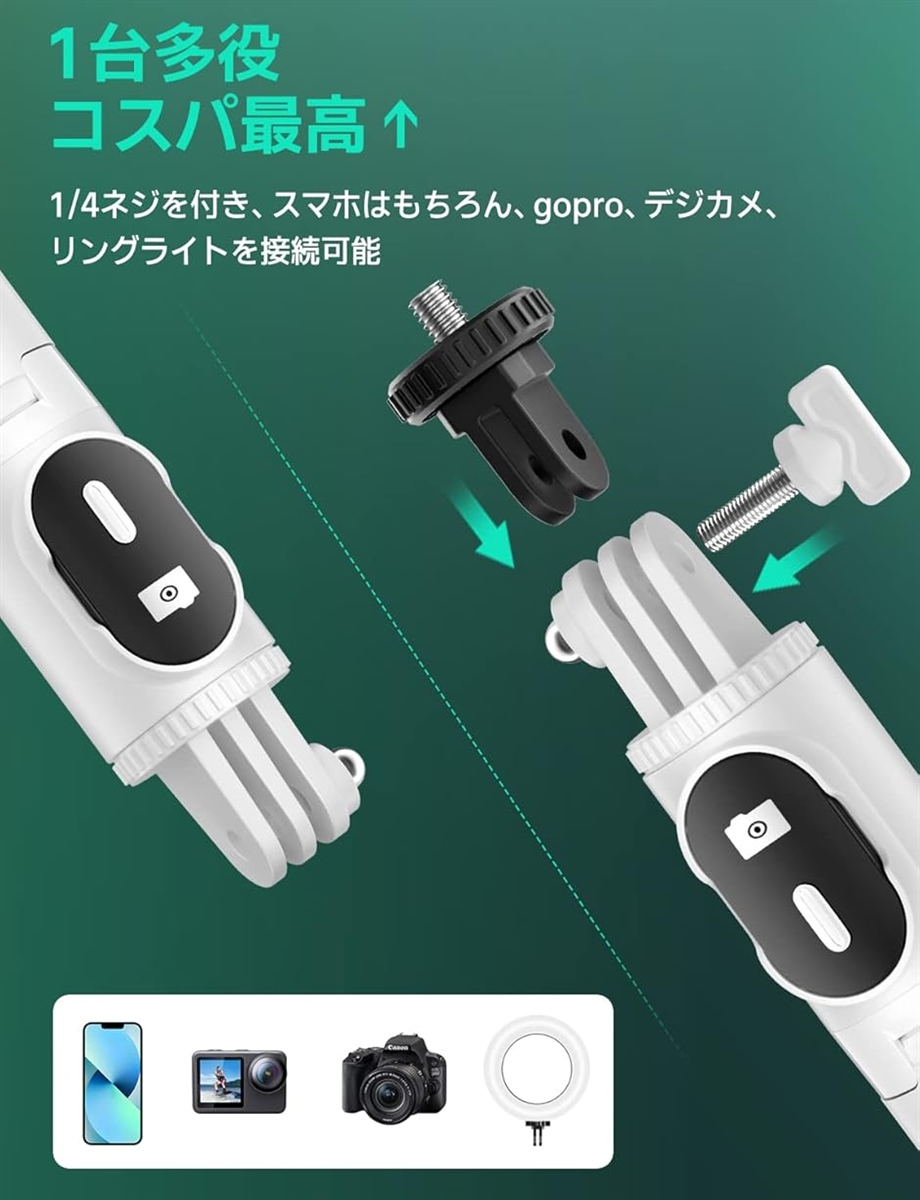 - バリエーションコード : 2brw4urgvf商品コード2b2wco2igi商品名自撮り棒 ミニ、安定モデルスマホスタンド 三脚 スマホ デジカメ兼用 じどり棒 iphone&android対応 じどりぼう スマホ 三脚 コンパクト リモコン付き 携帯スタンドブランドAilewuカラーホワイト「軽量、ポケットサイズ」Ailewuは自撮り棒を使用するシーンを考えて、数え切れないほどの実験の経て、自撮り棒の機能が満たされている状態で更に小型に進化しました。自撮り棒は71cmまで伸縮可能、折り畳んだ状態は16cm、500mlのペットボトルよりも小さい、薄さは半分ぐらい、ズボンのケットにも入ります。じどり棒の重量は約140g、市販商品と比べると35%軽量化して、持ち運びは非常に便利です。「小型のに安定性が劣らない」アンケート結果によると、従来の小型自撮り棒は安定性が弱い、倒れやすいなどの悩みがあります。Ailewu自撮り棒の三脚は頑丈な傘状構造が搭載、底部は滑り止めゴム素材の使用で、ダブル安定感が実現、倒れのことがありません。更に、本社のじどり棒は航空グレード素材ステンレス鋼を採用し、軽量で耐久性を高める、女性、子供でも気兼ねなく持て、旅行の撮影には最適です。「0遅延で写真を撮れる」自撮り棒の無線リモコンは最先端ブルートゥース5.2技術を採用、通信範囲や伝送速度が大幅にアップするため、境に左右されない優れた接続安定性を実現していて、ワンタップですぐに撮れる、遅延、途切れがありません。10m遠隔撮影が対応、家族写真、一人旅など素晴らしい全身写真が実現できます。初心者にも簡単操作できる、初期接続が完了すると、セルカ棒のリモコンは電源をオフにしても設定が残ります。再度電源オンにして、自動で最後に接続されていたスマホへ瞬時接続を実現しました。xブルートゥース機能が搭載されるAndroidとiOSのスマホに対応可能です。「360°+260°全方位自由調節」自 撮り 棒のクランプは従来型にある水平360°回転を受け継いだ以外、より一層改良できたところは上下260°回転実現、撮影角度を気にする必要はありません。横幅4~7インチのスマホをじどり棒のホルダーに装着するのが可能、小さい端末でも、大画面の端末でもしっかり固定できます。「4-in-1自撮り棒」自撮り棒は三脚を内蔵したタイプで、手持ちのセルフィーだけでなく、三脚 スマホスタンドとして動画鑑賞、集合写真、生放送、オンライン会議などにも適用です。用途の広いデザインにより、1/4ネジを付き、デジカメ用スタンド、アクションカメラ じどり棒、または生放送用リングライト 三脚としても使用できます。※ 他ネットショップでも併売しているため、ご注文後に在庫切れとなる場合があります。予めご了承ください。※ 品薄または希少等の理由により、参考価格よりも高い価格で販売されている場合があります。ご注文の際には必ず販売価格をご確認ください。※ 沖縄県、離島または一部地域の場合、別途送料の負担をお願いする場合があります。予めご了承ください。※ お使いのモニタにより写真の色が実際の商品の色と異なる場合や、イメージに差異が生じることがあります。予めご了承ください。※ 商品の詳細(カラー・数量・サイズ 等)については、ページ内の商品説明をご確認のうえ、ご注文ください。※ モバイル版・スマホ版ページでは、お使いの端末によっては一部の情報が表示されないことがあります。すべての記載情報をご確認するには、PC版ページをご覧ください。技術基準適合証明番号:214-111604