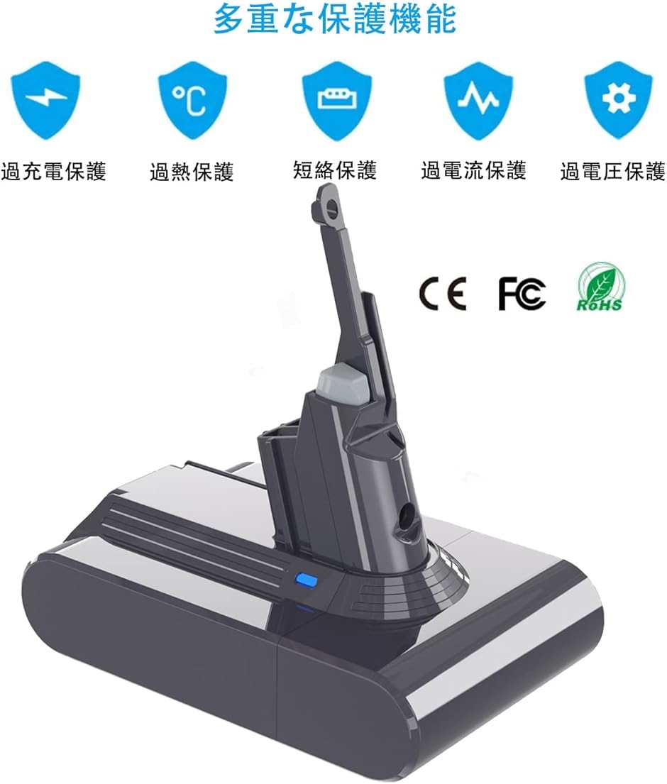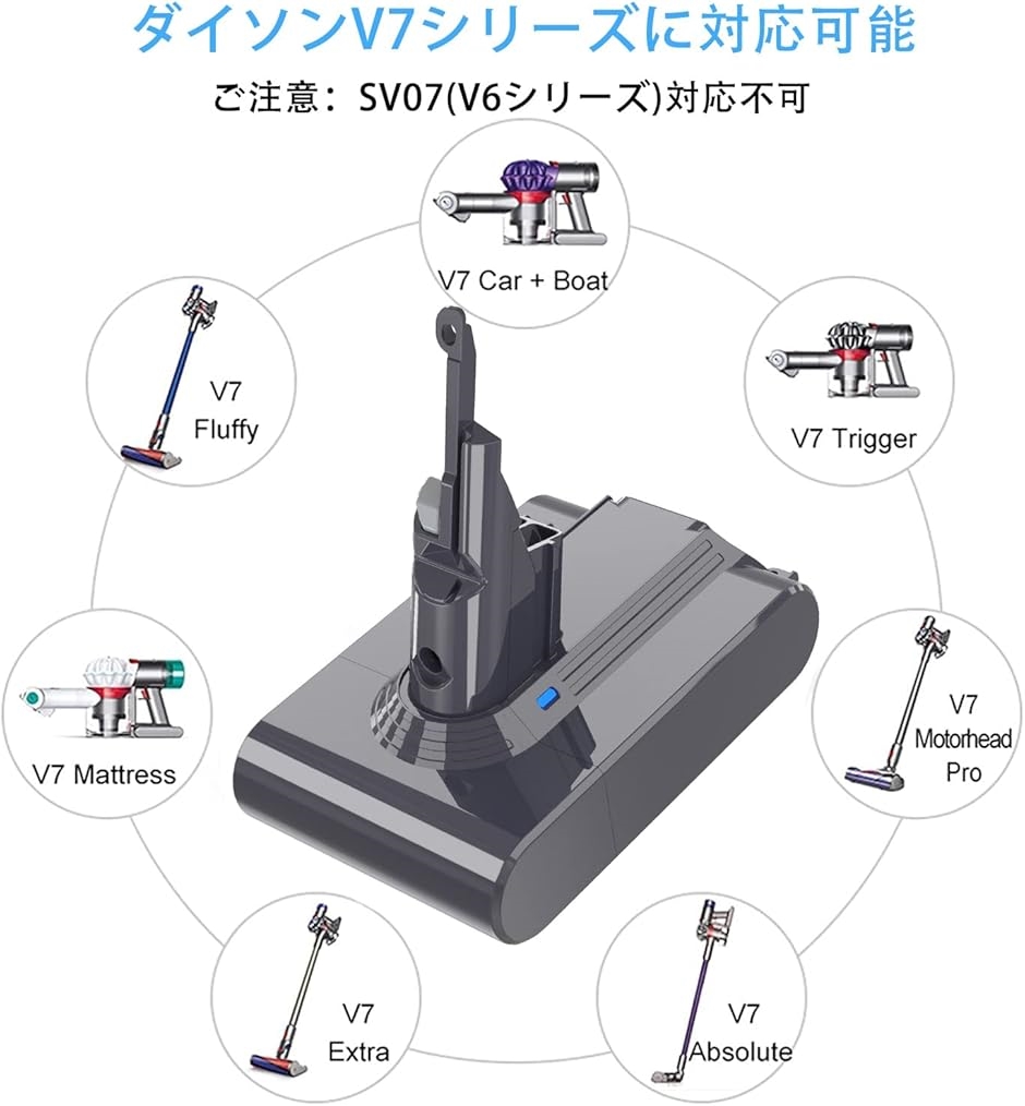 - バリエーションコード : 2b9kvo866x商品コード2b68t94v08商品名互換品 V7 バッテリー 交換品 互換品 ダイソン対応 V7 バッテリー SV11バッテリー 21.6V 4000mAh V7 Fluffy V7 Motorhead V7 Trigger V7 Car+Boat V7 Absolute 対応 SV07対応不可 掃除機ブランドKUNLUNサイズ等電池単体「対応機種」ダイソンV7シリーズ:V7 Fluffy ,V7 Fluffy+ ,V7 Absolute ,V7 Absolute Extra,V7Motorhead ,V7 Trigger ,V7Car+Boat ,SV11 ,純正品と完全に互換 壁掛けブラケット対応。ご注意:V7とSV07は、見た目はよく似ていますが、全く異なるモデルです。(SV07は別のシリーズのV6/DC62の型番名称です。購入時にご確認ください。)「多重保護機能」過電流保護、過充電保護、過電圧保護、過熱保護、短絡保護機能が備わっています。安全で使用することを確保する。ご注意:長持ちように、バッテリー残量がなくなる前に充電したほうが長持ちします。また、長時間お使わない場合、必ず満充電してから保管しまてください。「耐久性」内部は6つのリチウムイオン電池セルで組み立て、安全性が高い、性能が安定です。自然放電が少ないため、長期保存しても満充電に近い電池で作業ができ、高い耐久性を実現します。掃除機の吸着力も改善になります。「組み立て簡単」組み立てが簡単にできます。ドライバーでネジを緩め、バッテリーを取り付けた後、ネジを締めて組み立てを完了します。満充電後、20分ほど冷却してから使用してください。そうしないと、高温保護機能でオレンジ色が点滅して、しばらく作動出来ないです。※ 他ネットショップでも併売しているため、ご注文後に在庫切れとなる場合があります。予めご了承ください。※ 品薄または希少等の理由により、参考価格よりも高い価格で販売されている場合があります。ご注文の際には必ず販売価格をご確認ください。※ 沖縄県、離島または一部地域の場合、別途送料の負担をお願いする場合があります。予めご了承ください。※ お使いのモニタにより写真の色が実際の商品の色と異なる場合や、イメージに差異が生じることがあります。予めご了承ください。※ 商品の詳細(カラー・数量・サイズ 等)については、ページ内の商品説明をご確認のうえ、ご注文ください。※ モバイル版・スマホ版ページでは、お使いの端末によっては一部の情報が表示されないことがあります。すべての記載情報をご確認するには、PC版ページをご覧ください。*PSマーク取得済み製品*製品型番:V7届出事業者名:株式会社成洋PSマークの種類:PSE「適合型番」ダイソンV6 バッテリー 掃除機 交換用 DC62、DC58、DC59、DC61、DC72、DC74、V6(SV03、SV04、SV07、SV08、HH08、SV09、Slim、Motorhead、Animalpro、Fluffy、trigger+、Car Boat、mattress、Origin)などv6全シリーズ掃除機対応しております。*ダイソン純正の壁掛けユニットも問題なくご使用いただます。「安全保護機能」高品質バッテリーセルを搭載しており、過電流保護、過充電防止、過放電防止などの保護機能がバッテリーを長寿命化を実現します。ご注意:長持ちように、バッテリー残量がなくなる前に充電したほうが長持ちします。また、長時間お使わない場合、必ず満充電してから保管しまてください。PSE認証登録済。「掃除機用のバッテリーとフィルターのセット」純正フィルターと同じ使用です。静電気綿の材料を採用しており洗濯可能、再使用可能です。使用状況に応じて、毎回あるいは数回洗浄する必要があります。高密度で塵、埃、および他のアレルゲンを捕捉することができます。