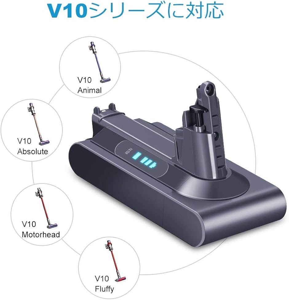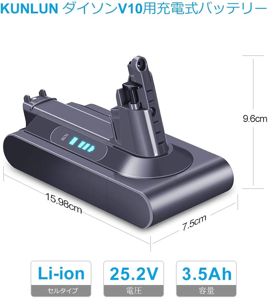 - バリエーションコード : 2b9kvo866x商品コード2b628pv15c商品名互換品 ダイソン適用 V10 バッテリー SV12 バッテリー 壁掛けブラケット対応 V10 Animal V10 Absolute V10 Motorhead V10 Fluffy V10 Total Clean Cordless Stick Vacuum Cleanerなど対応 交換品 V10 3500mAhブランドKUNLUNサイズ等16x11x8「対応機種」V10 Fluffy/V10 Fluffy+/ V10 Absolute/ V10 Motorhead/ V10 Animal/V10cyclone対応しています。壁掛けにも対応します。ご注意:当商品は純正品ではありません、交換性のある予備バッテリーです。「安全保護」安全の為に過電流、過充電、過電圧、過熱、短絡防止の保護回路を搭載しております。工場出荷時に入念なテストを繰り返す事で品質レベルを安定させています。安定した電圧回路を提供し、バッテリーの寿命と安全性も向上。毎日手軽に掃除ができます。「3500mAh大容量」:3500mAhの大容量により、バッテリーのサイズを変えることなくバッテリー寿命が改良され、純正品と同じ作業効率が確保できます。お届けまでに少し電量が消耗しますので、新品バッテリーを満タン充電してから使用してください。長時間使わない場合、必ず満充電してから保管してください。「装着簡単」: バッテリーケースはポリマー素材で作られており、耐久性に優れています;内部は6つのリチウムイオン電池セルで組み立てられ、安全性高く、性能が安定しています。誰でも簡単に装着できます。※ 他ネットショップでも併売しているため、ご注文後に在庫切れとなる場合があります。予めご了承ください。※ 品薄または希少等の理由により、参考価格よりも高い価格で販売されている場合があります。ご注文の際には必ず販売価格をご確認ください。※ 沖縄県、離島または一部地域の場合、別途送料の負担をお願いする場合があります。予めご了承ください。※ お使いのモニタにより写真の色が実際の商品の色と異なる場合や、イメージに差異が生じることがあります。予めご了承ください。※ 商品の詳細(カラー・数量・サイズ 等)については、ページ内の商品説明をご確認のうえ、ご注文ください。※ モバイル版・スマホ版ページでは、お使いの端末によっては一部の情報が表示されないことがあります。すべての記載情報をご確認するには、PC版ページをご覧ください。ご注意:バッテリーは高温保護がありますので、一時的に充電できない可能性があります。バッテリーをしばらく置いて冷ますと正常に充電できます。「V10互換バッテリー 長寿命 高品質」電圧:25.2V 容量:3500mAh電池:Li-ion リチウムイオン充電時間:3.5-4.5時間充電方法:純正品と同じです(純正/互換充電器で充電できます)充電指示は下記の通り、三つのledランプがあります。充電エラーの場合、赤ランプは点滅します。「対応機種」:Cyclone V10 Fluffy;Cyclone V10 Motorhead;Cyclone V10 Absolute;Cyclone V10 Animal Pro;Cyclone V10 Animal Lightweightご注意:型番SV10はダイソンV8シリーズです。SV10に対応不可です。「保護機能」過電流保護、過充電防止、過電圧保護、過熱防止、短絡防止などの保護回路が搭載されており、安全に使用することができます。「使用注意事項」ご使用前に新しいバッテリーを満充電してください。バッテリーの寿命を延ばすには、バッテリーが切れる前に充電してください。バッテリーの機能を維持するために、定期的に充放電を行ってください。充電中に掃除機を使用したり、バッテリーボタンを押したりしないでください。長持ちのように、バッテリーが上がった直後に充電しないでください。充電する前に、約10~20分でバッテリーを冷却させてください。(特にMaxモードで 使用され、バッテリーが熱い場合)*PSマーク取得済み製品*製品型番:V10届出事業者名:株式会社成洋PSマークの種類:PSE