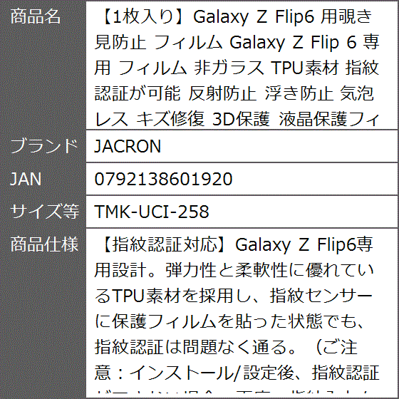 1枚入りGalaxy Z Flip6 用覗き見防止 フィルム 専用 非ガラス TPU素材 指紋認証が可能 MDM(TMK-UCI-258)