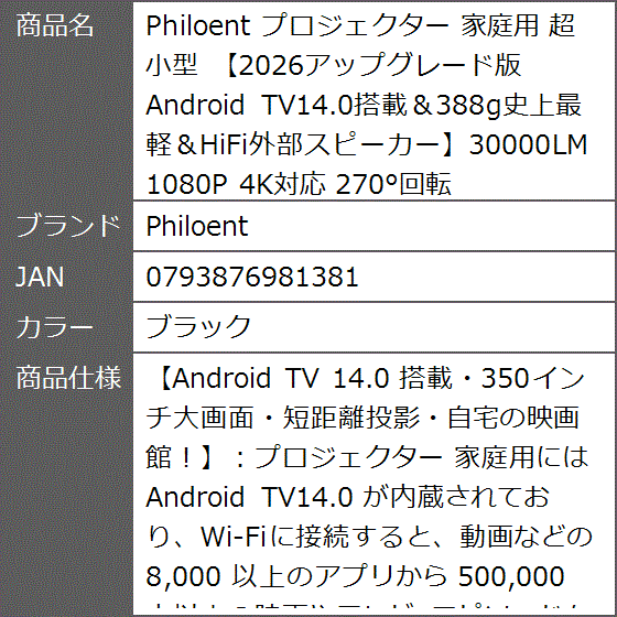 - バリエーションコード : 2br1pvju5i商品コード2buschn1rc商品名プロジェクター 家庭用 超小型 2026アップグレード版Android TV14.0搭載&388g史上最軽&HiFi外部スピーカー30000LM 1080P 4K対応 270°回転ブランドPhiloentカラーブラック「Android TV 14.0 搭載・350インチ大画面・短距離投影・自宅の映画館。」:プロジェクター 家庭用にはAndroid TV14.0 が内蔵されており、Wi-Fiに接続すると、動画などの8,000 以上のアプリから 500,000 本以上の映画やテレビ エピソードを楽しめます。要件に応じてアプリストア から豊富なアプリをダウンロードできて、TVスティックを別途購入や複雑な設定は一切不要です。0.5M~3Mまで短距離投影でき、小さい部屋でも十分に使え、手軽に30インチから350インチまでの大画面で楽しめます。ホームプロジェクター は270°自由に回転できる一体型デザインを採用しており、三脚を使用せずに自由に投影角度を選択で、座ったり、寝転んだり、横向きになったりしながら、リラックスした映画鑑賞体験を実現できます。「高音質HiFi外部スピーカー・超高速Wi-Fi 6・Bluetooth5.4」:このぷろじえくたー 家庭用 小型は高品質 HiFi 外部スピーカーとBluetooth 5.4 が内蔵しており、自宅で迫力の3Dサウンドを楽しむことができ、臨場感あふれる映画館のような空間を演出します。高精度チップ技術を使用してある本小型プロジェクターは、2.4G+5Gの周波数帯を同時利用でき、安定した信号と高い伝送速度を備えた超高速 6G WiFi 接続テクノロジーも備えています。iOS、Android、Windows デバイス (ミラーリング対応のスマートフォン、タブレット、コンピューターなど) を Wi-Fi 経由ですばやく接続し、非常にスムーズで遅延のないオンライン ゲーム、映画鑑賞、ビデオ体験を簡単に楽しめます。「30000LM高輝度・1080P高解像度・4K対応」:この家庭用プロジェクターは、高精度微小レンズを搭載し、30000LMの高輝度と15000:1の高コントラスト比を実現しました。スクリーンなしで白い壁に直接投影でき、1080PフルHD対応可能で、NTSC 色域効果の 99% 以上を復元し、よりリアルな画像やビデオを映し出します。4Kに対応な高画質技術を搭載し、美しい映像の再生をお楽しみいただけます。さらに、目に優しい拡散光イメージングとアンチブルーライト技術により、直射光よりも柔らかい光源で、子供やお年寄りでもご安心に好きなアニメやテレビ番組などを楽しみください。「388gの史上最軽量・270°回転・自動台形補正」:このコンパクトプロジェクターは、他のプロジェクターよりも小型・軽量で携帯性に優れ、史上最軽量のプロジェクターです。この小型プロジェクターは、270°回転可能な一体型スタンドを搭載し、スタンドを回転するだけで、自由に投影角度を選択して、壁や天井などに投影できます。天井プロジェクターは自動台形補正機能を搭載し、面倒な手動操作にさよなら、プロジェクターを上下に任意の角度に傾けると、一瞬で自動台形補正を実行します。「多彩な互換性・超長い寿命・プレゼント」プロジェクター は無線でも有線でも接続する家庭用プロジェクターはWi-FiとBluetooth接続に加えて、HDMI、USB、PC、DVDプレーヤー、タブレット、USBストレージ、PSゲーム機、スピーカー、ヘッドフォンなど、さまざまなデバイスと互換性があります。超小型プロジェクター は放熱効果が良くて「150,000時間」以上の超長寿命を実現しております。少人数でのプレゼンテーションや会議などのビジネスユースはもちろん、大画面でゲームを楽しみたい方にもおすすめ。お祝いや誕生日のプレゼントにも最適です。※ 他ネットショップでも併売しているため、ご注文後に在庫切れとなる場合があります。予めご了承ください。※ 品薄または希少等の理由により、参考価格よりも高い価格で販売されている場合があります。ご注文の際には必ず販売価格をご確認ください。※ 沖縄県、離島または一部地域の場合、別途送料の負担をお願いする場合があります。予めご了承ください。※ お使いのモニタにより写真の色が実際の商品の色と異なる場合や、イメージに差異が生じることがあります。予めご了承ください。※ 商品の詳細(カラー・数量・サイズ 等)については、ページ内の商品説明をご確認のうえ、ご注文ください。※ モバイル版・スマホ版ページでは、お使いの端末によっては一部の情報が表示されないことがあります。すべての記載情報をご確認するには、PC版ページをご覧ください。技術基準適合証明番号:217-252225