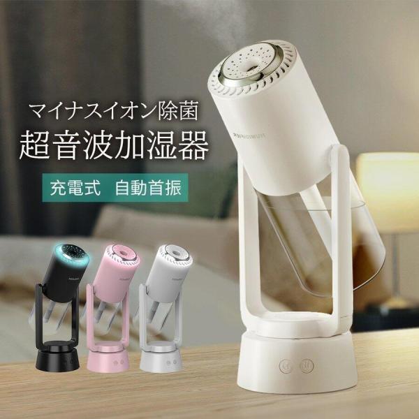 「最新型」充電式加湿器 自動首振り 卓上加湿器 マイナスイオン除菌機能付き 小型 空気清浄機 次亜塩素酸水対応 アロマ対応 除菌対応 空焚き防止 乾燥防止