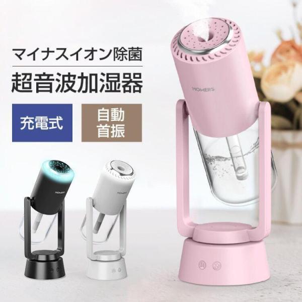 加湿器 自動首振り充電式 小型 卓上加湿器 角度調整 超音波式 マイナスイオン除菌機能付き 空気清浄機 次亜塩素酸水対応アロマ対応 除菌対応空焚き防止 乾燥防止