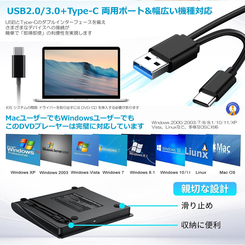 ●USB2.0/3.0+Type-C両用ポート&8XDVD +24XCD