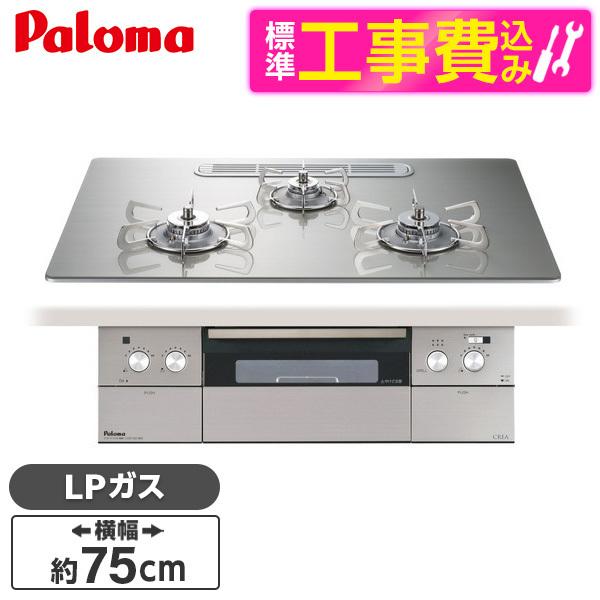 パロマ PD-963WT-U75GH-LP 標準設置工事セット シャインシルバー CREA ビルトインガスコンロ(プロパンガス用・両側強火タイプ・幅75cm)