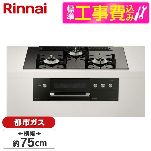 Rinnai RHS71W30E11RABW-13A 標準設置工事セット ナイトブラック DELICIA ビルトインガスコンロ (都市ガス用・両側強火力・幅75cm)