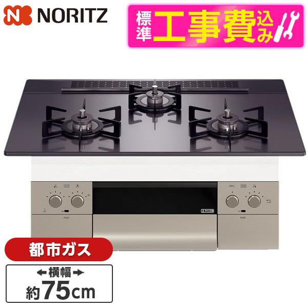 NORITZ N3WU4PWASQSTEC-13A 標準設置工事セット Orche FLAT ビルトインガスコンロ (都市ガス用 3口 両側強火力 75cmタイプ)