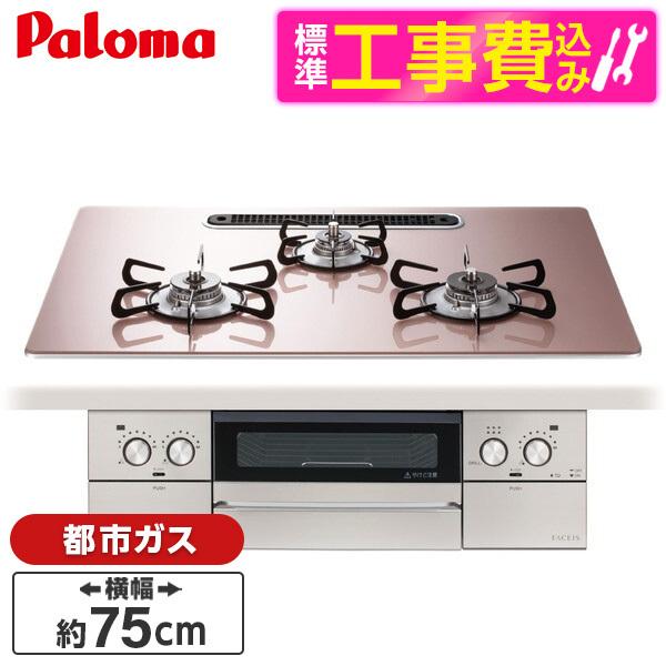 パロマ PD-893WS-U75GP-13A 標準設置工事セット シルキーピンク フェイシス グランド ビルトインガスコンロ (都市ガス用・3口・左右強火タイプ・幅75cm)