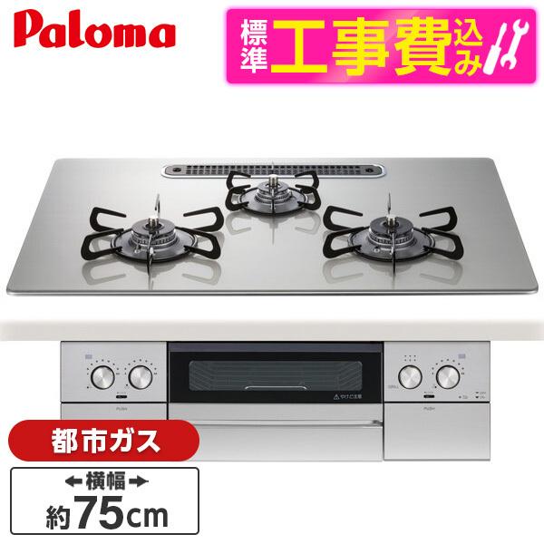 パロマ PD-829WS-U75GH-13A 標準設置工事セット シャインシルバー WITHNA (ウィズナ) ビルトインガスコンロ (都市ガス用・3口・左右強火タイプ・幅75cm)