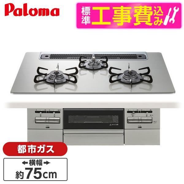 パロマ PD-743WS-75GH-13A 標準設置工事セットシャインシルバー BRilliOα ブリリオアルファ ビルトインガスコンロ (都市ガス・75cm・3口・水無し両面焼き)