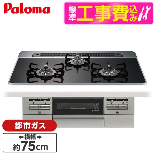 パロマ PD-743WS-75CK-13A 標準設置工事セットクリアパールブラック BRilliO ブリリオ ビルトインガスコンロ (都市ガス・75cm・3口・水無し両面焼き)