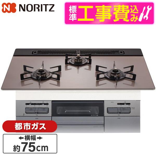 NORITZ N3WV7RWAP3SIEC-13A 標準設置工事セット Mikke (ミッケ) ビルトインガスコンロ (都市ガス用・3口・両側強火タイプ・幅75cm)