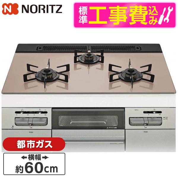 NORITZ N3WV6RWAP3SIEC-13A 標準設置工事セット Mikke (ミッケ) ビルトインガスコンロ (都市ガス用・3口・両側強火タイプ・幅60cm)