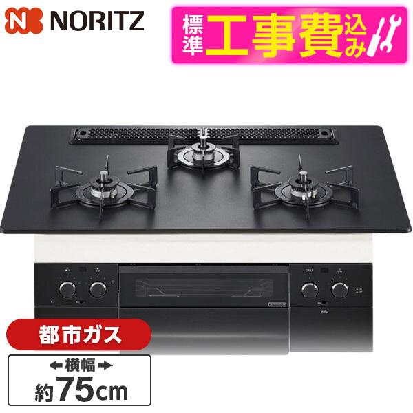 NORITZ N3WU4PWAAFBAEC-13A 標準設置工事セット Orche (オルシェ) ビルトインガスコンロ (都市ガス用・3口・両側強火タイプ・幅75cm)