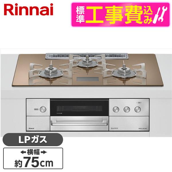 Rinnai RHS72W38M12VNSTW-LP 標準設置工事セット スパークリングカッパー DELICIA ビルトインガスコンロ(プロパンガス用・両側強火タイプ・3口・75cm)